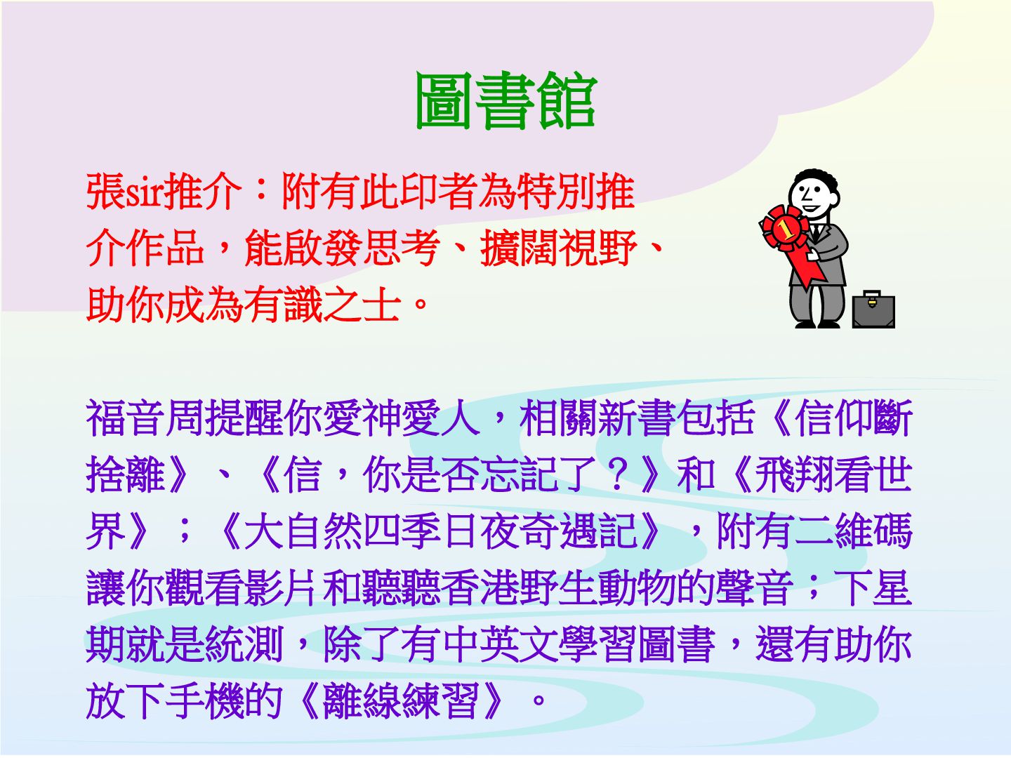 圖書館 張sir推介:附有此印者為特別推 介作品,能啟發思考、擴闊視野、 助你成為有識之士。 福音周提醒你愛神愛人,相關新書包括《信仰斷 捨離》、《信,你是否忘記了?》和《飛翔看世 界》;《大自然四季日夜奇遇記》,附有二維碼 讓你觀看影片和聽聽香港野生動物的聲音;下星 期就是統測,除了有中英文學習圖書,還有助你 放下手機的《離線練習》。