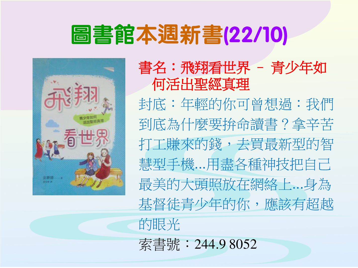 圖書館本週新書(22/10) 書名:飛翔看世界 – 青少年如 何活出聖經真理 封底:年輕的你可曾想過:我們 到底為什麼要拚命讀書?拿辛苦 打工賺來的錢,去買最新型的智 慧型手機...用盡各種神技把自己 最美的大頭照放在網絡上...身為