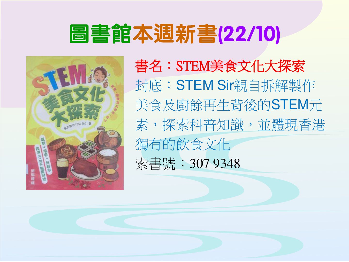 圖書館本週新書(22/10) 書名:STEM美食文化大探索 封底:STEM Sir親自拆解製作 美食及廚餘再生背後的STEM元 素,探索科普知識,並體現香港 獨有的飲食文化 索書號:307 9348