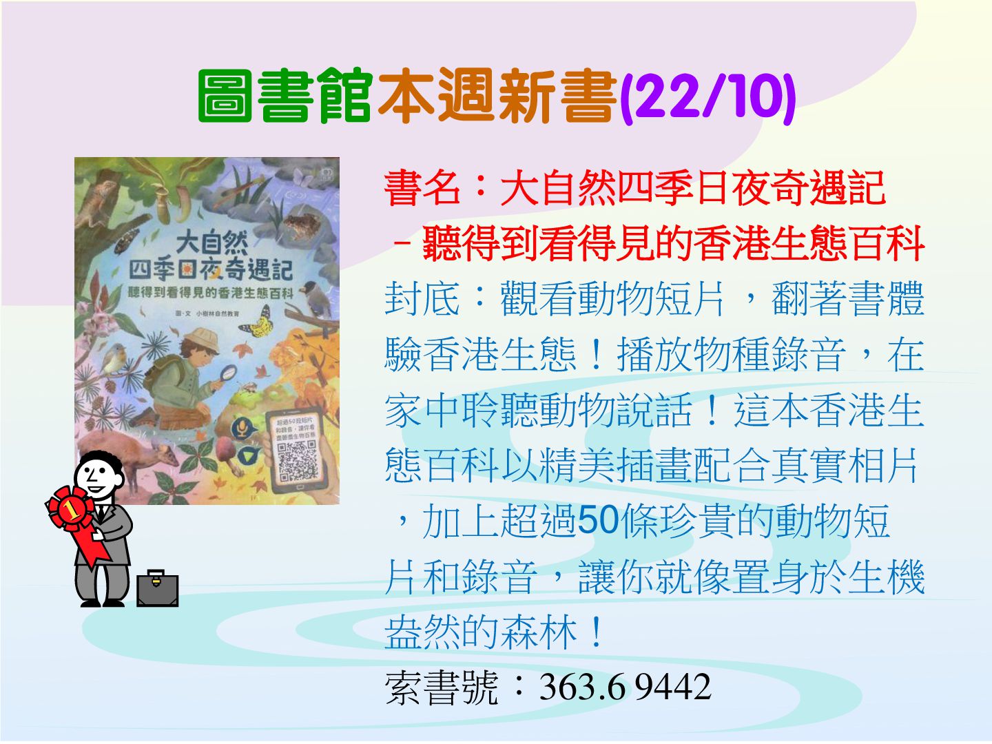 圖書館本週新書(22/10) 書名:大自然四季日夜奇遇記 –聽得到看得見的香港生態百科 封底:觀看動物短片,翻著書體 驗香港生態!播放物種錄音,在 家中聆聽動物說話!這本香港生 態百科以精美插畫配合真實相片 ,加上超過50條珍貴的動物短 片和錄音,讓你就像置身於生機 盎然的森林!