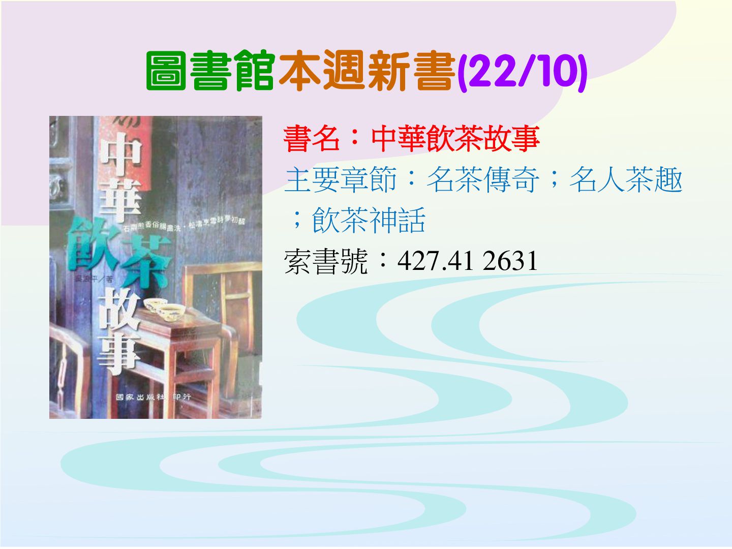 圖書館本週新書(22/10) 書名:中華飲茶故事 主要章節:名茶傳奇;名人茶趣 ;飲茶神話 索書號:427.41 2631