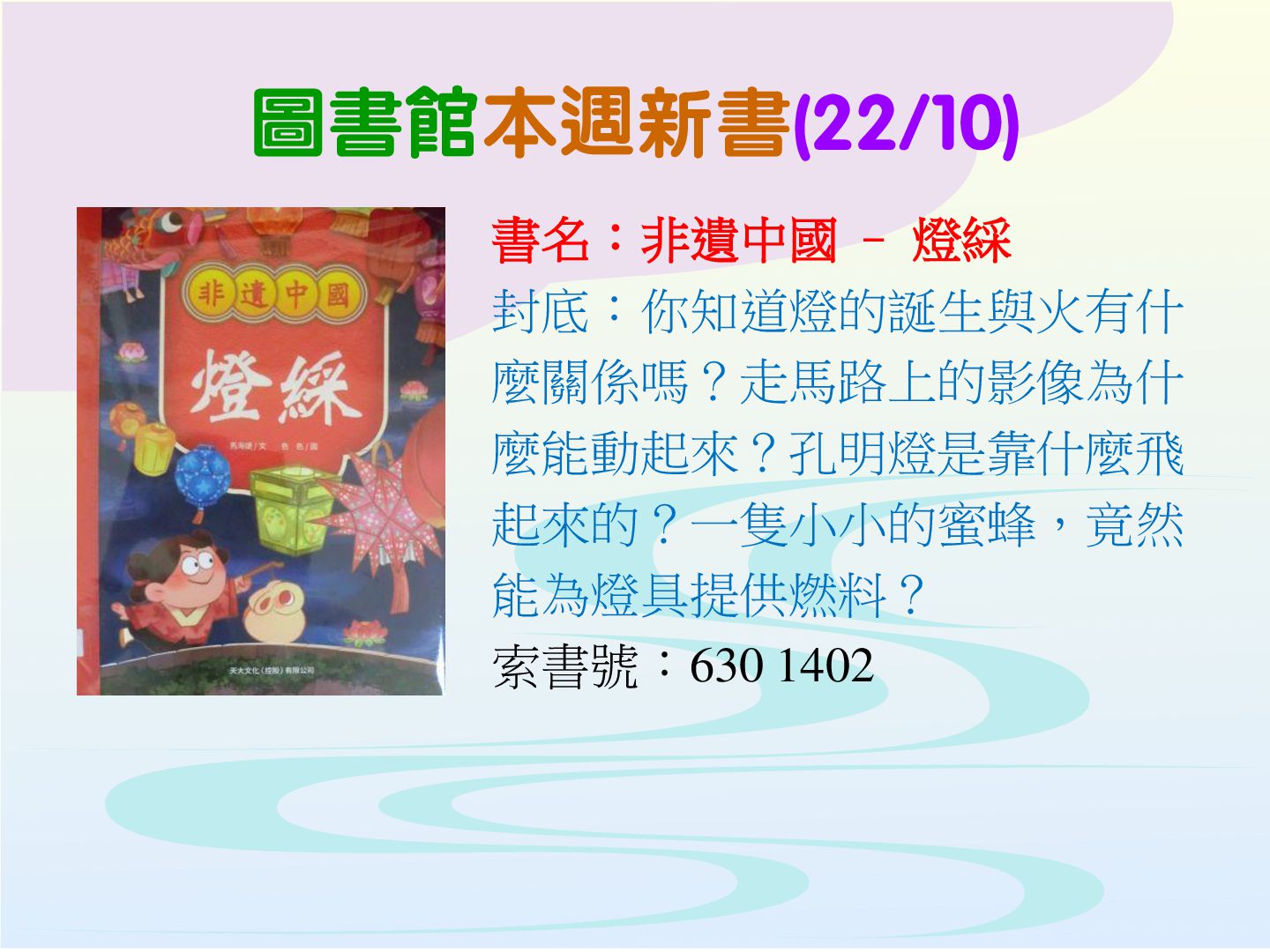 圖書館本週新書(22/10) 書名:非遺中國 – 燈綵 封底:你知道燈的誕生與火有什 麼關係嗎?走馬路上的影像為什 麼能動起來?孔明燈是靠什麼飛 起來的?一隻小小的蜜蜂,竟然 能為燈具提供燃料? 索書號:630