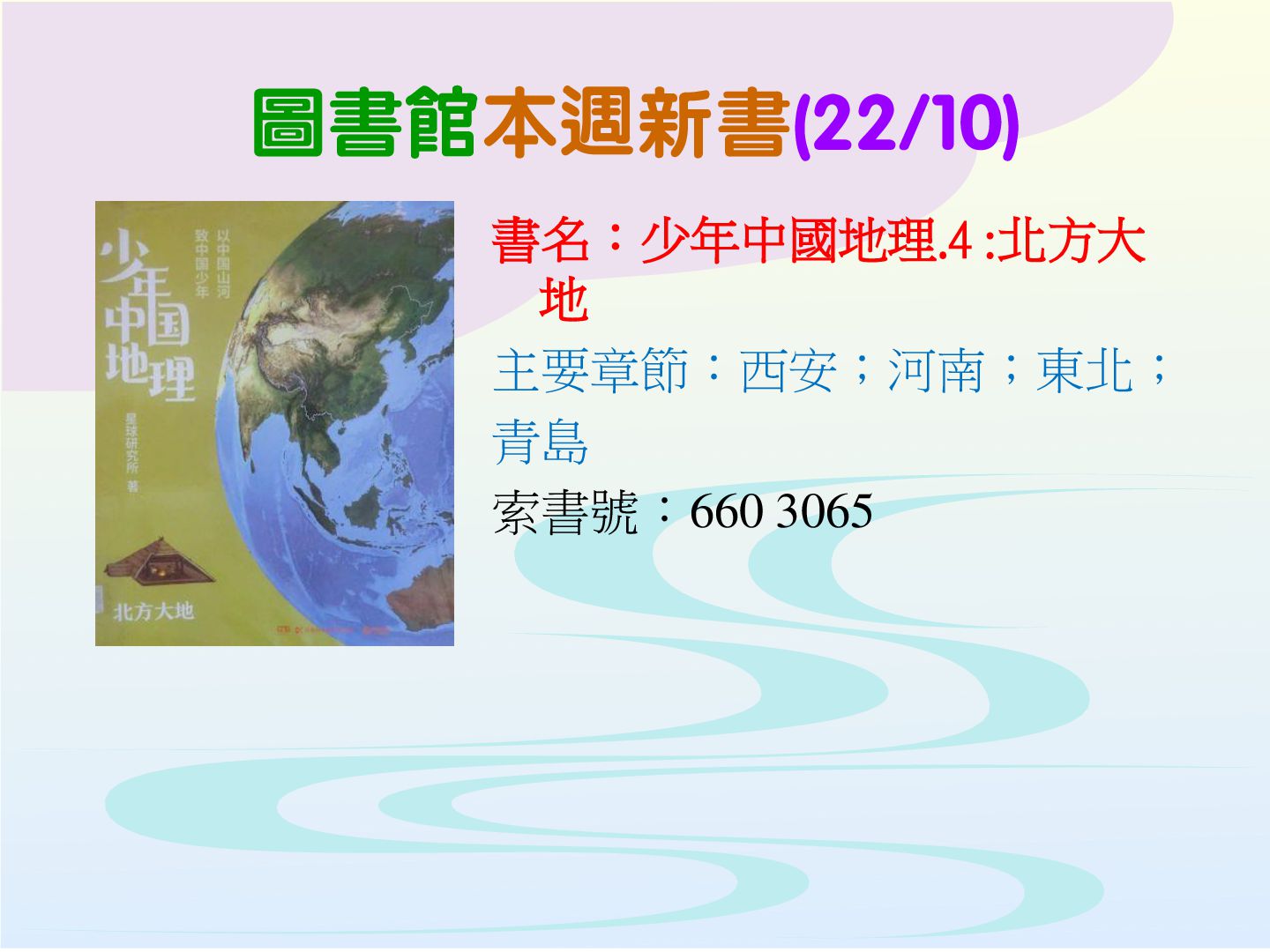 圖書館本週新書(22/10) 書名:少年中國地理.4 :北方大 地 主要章節:西安;河南;東北; 青島 索書號:660 3065