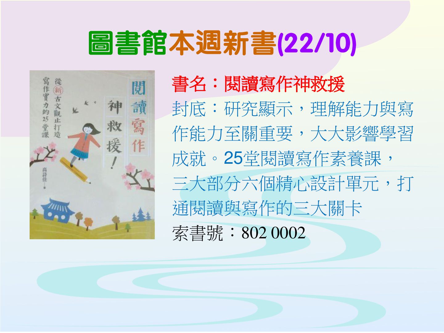 圖書館本週新書(22/10) 書名:閱讀寫作神救援 封底:研究顯示,理解能力與寫 作能力至關重要,大大影響學習 成就。25堂閱讀寫作素養課, 三大部分六個精心設計單元,打 通閱讀與寫作的三大關卡 索書號:802 0002