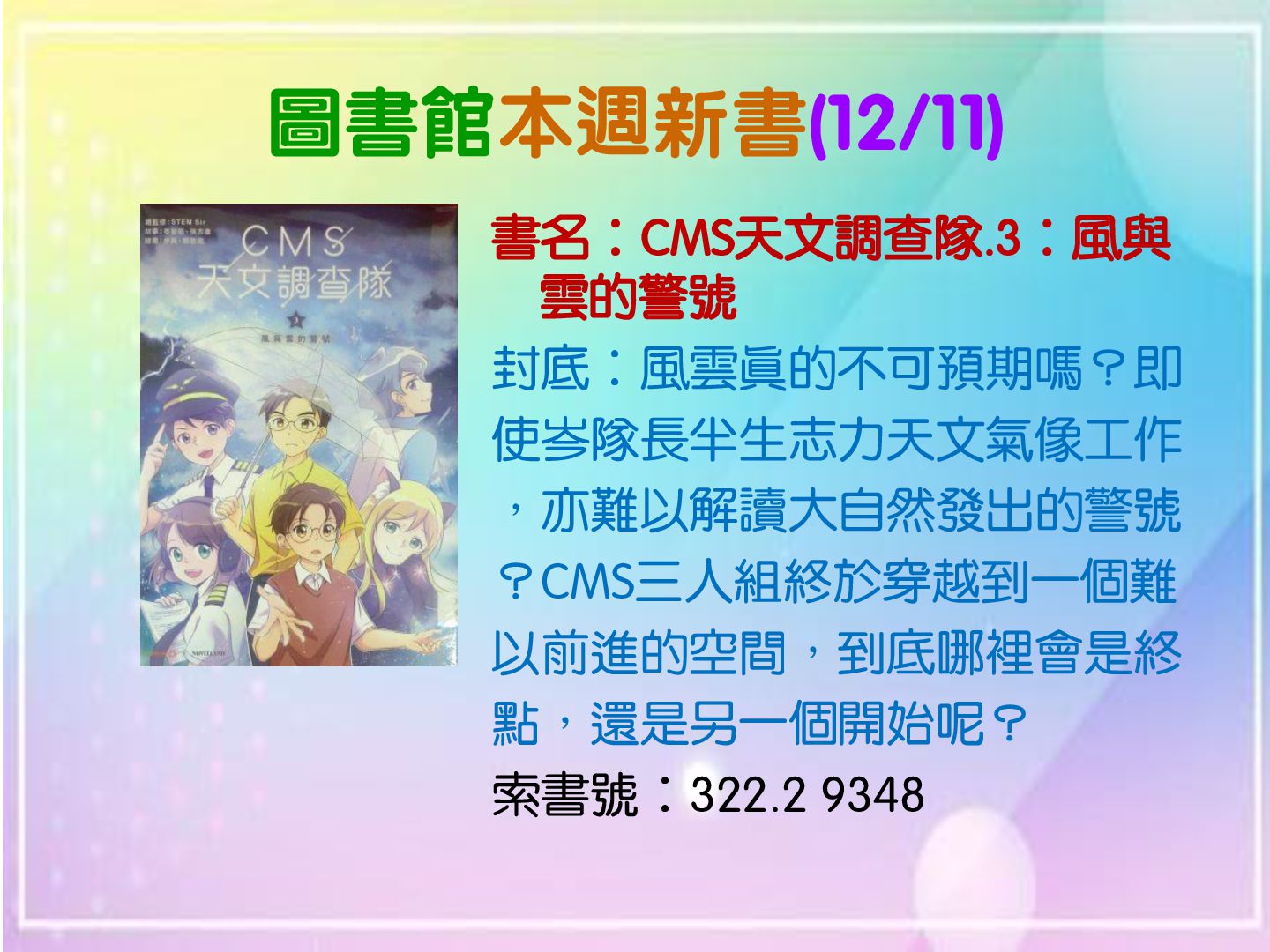 圖書館本週新書(12/11) 書名:CMS天文調查隊.3:風與 雲的警號 封底:風雲真的不可預期嗎?即 使岑隊長半生志力天文氣像工作 ,亦難以解讀大自然發出的警號 ?CMS三人組終於穿越到一個難 以前進的空間,到底哪裡會是終 點,還是另一個開始呢? 索書號:322.2