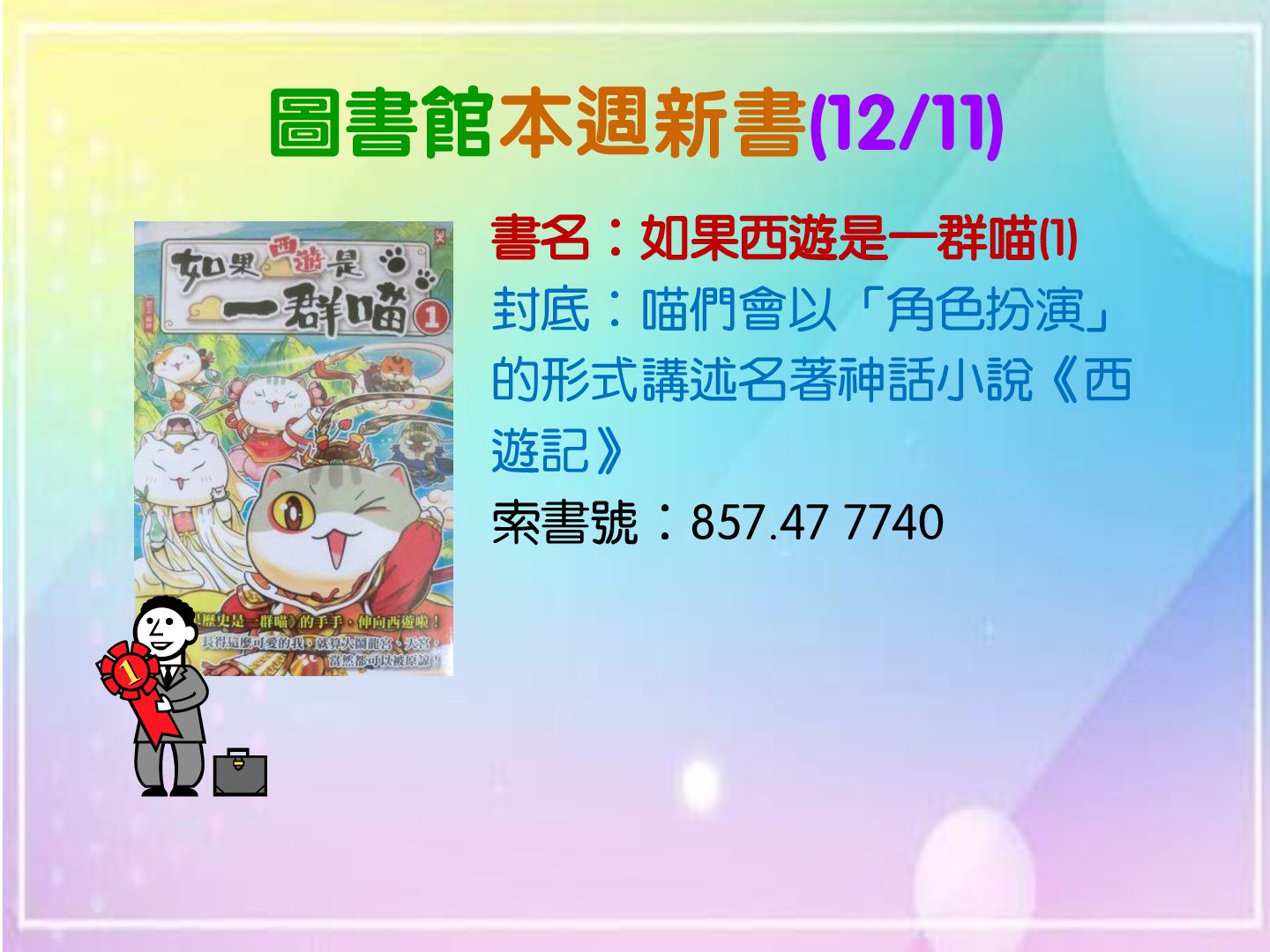 圖書館本週新書(12/11) 書名:如果西遊是一群喵(1) 封底:喵們會以「角色扮演」 的形式講述名著神話小說《西 遊記》 索書號:857.47 7740