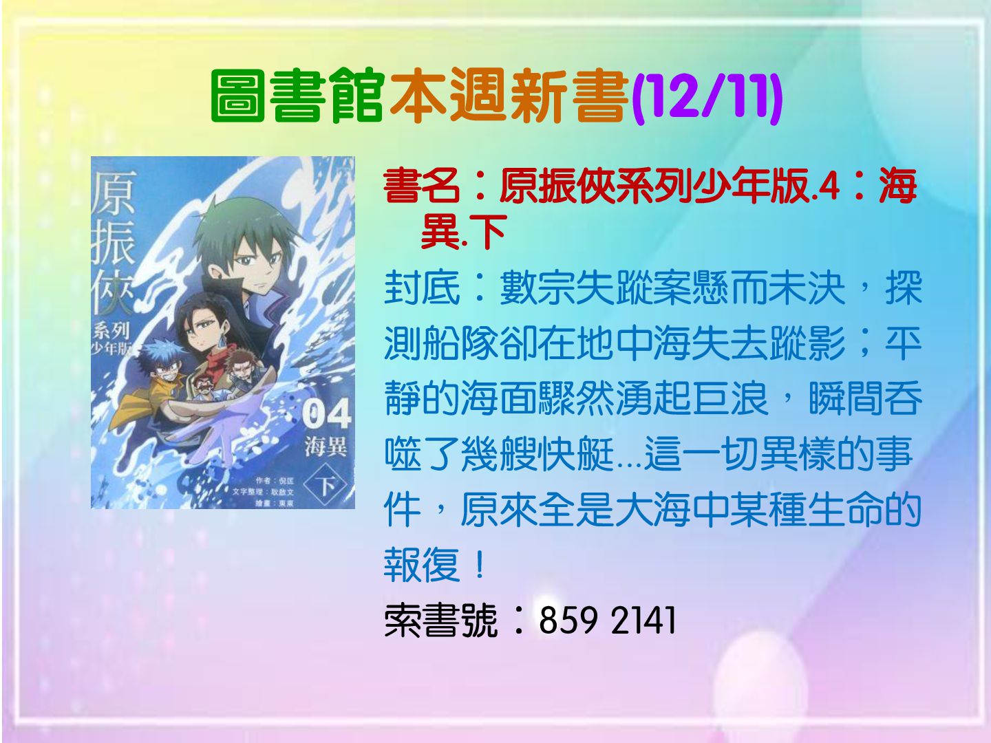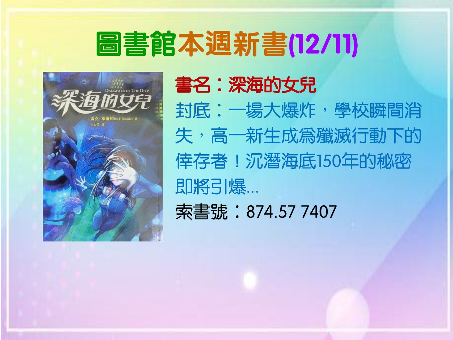 圖書館本週新書(12/11) 書名:深海的女兒 封底:一場大爆炸,學校瞬間消 失,高一新生成為殲滅行動下的 倖存者!沉潛海底150年的秘密 即將引爆... 索書號:874.57 7407