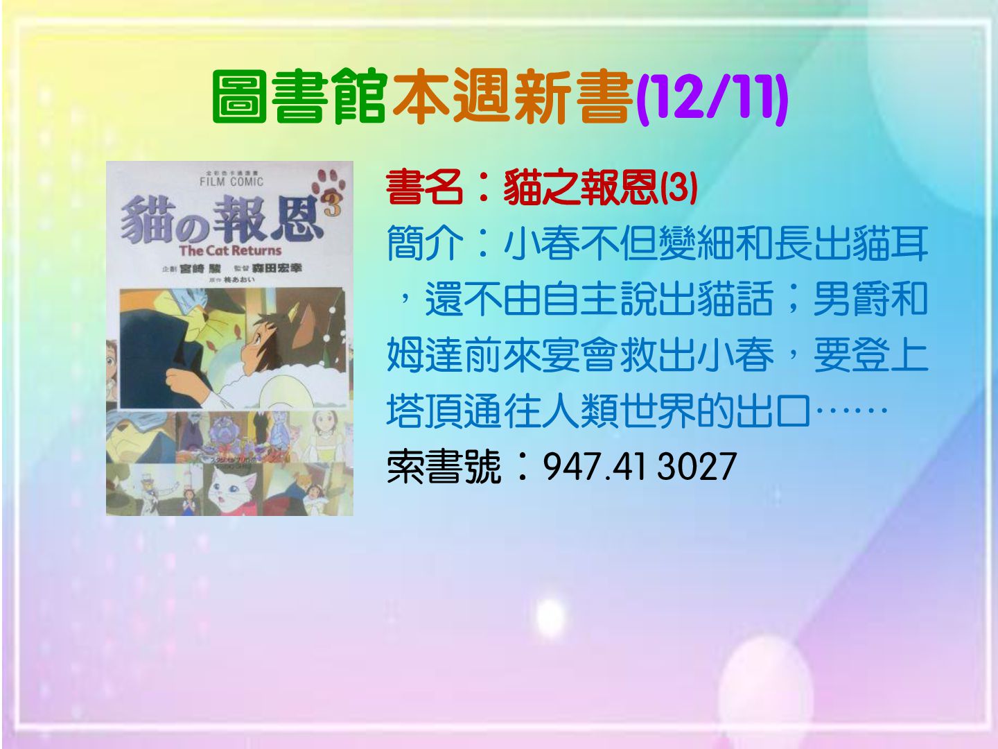 圖書館本週新書(12/11) 書名:貓之報恩(3) 簡介:小春不但變細和長出貓耳 ,還不由自主說出貓話;男爵和 姆達前來宴會救出小春,要登上 塔頂通往人類世界的出口…… 索書號:947.41 3027