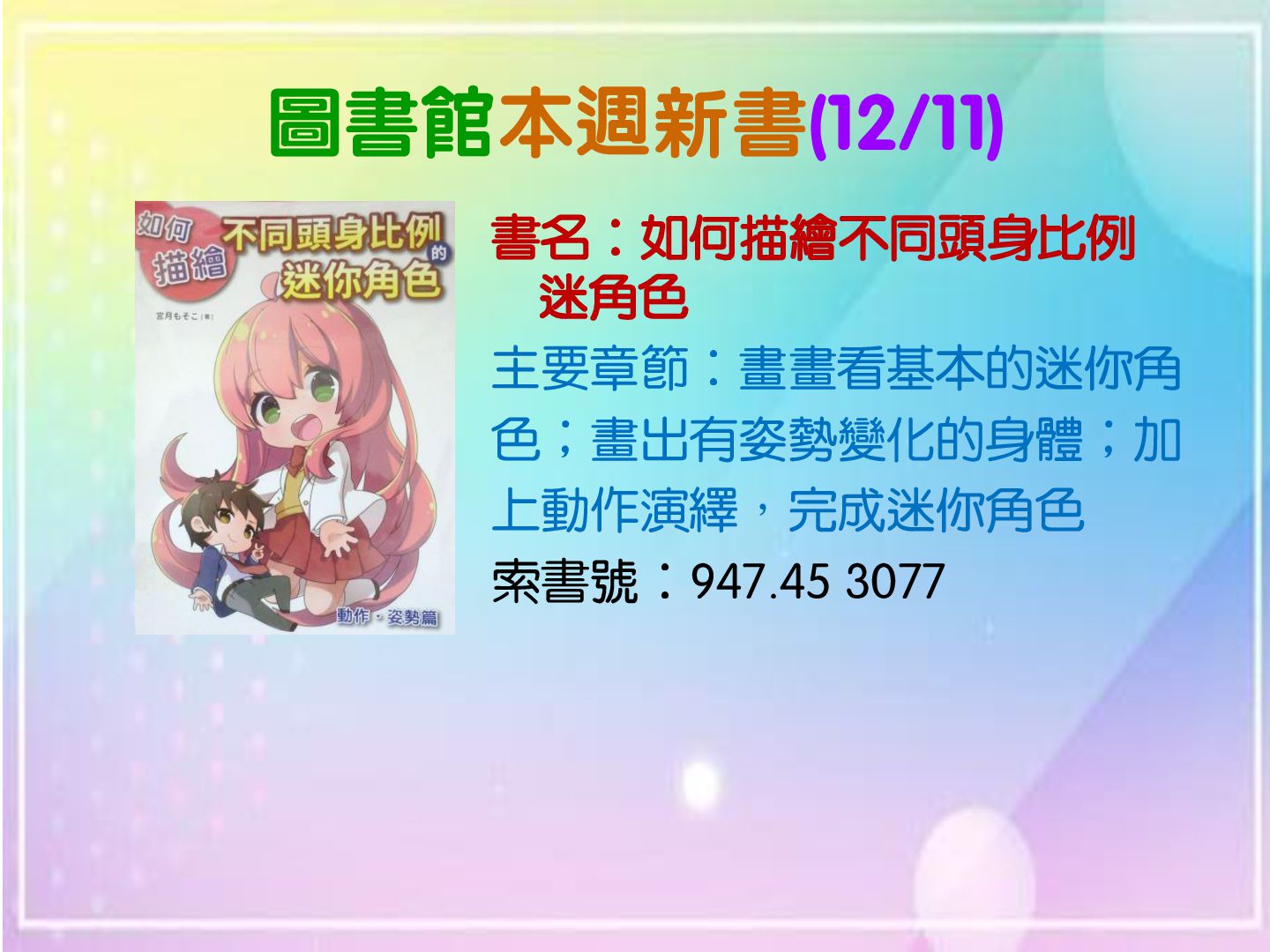 圖書館本週新書(12/11) 書名:如何描繪不同頭身比例 迷角色 主要章節:畫畫看基本的迷你角 色;畫出有姿勢變化的身體;加 上動作演繹,完成迷你角色 索書號:947.45 3077