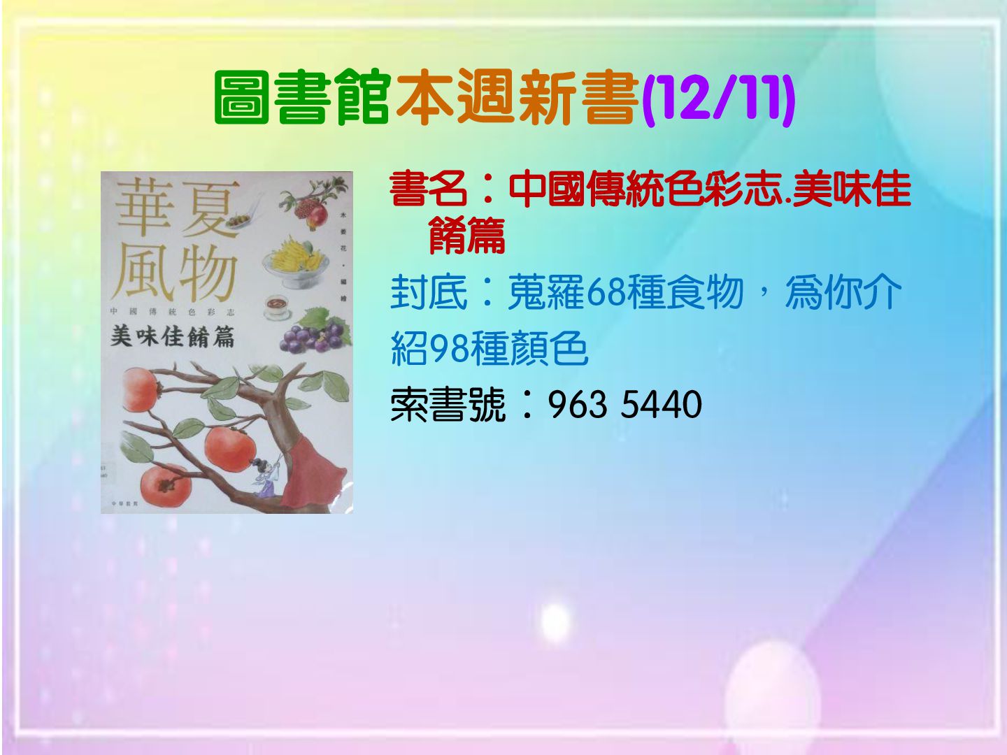 圖書館本週新書(12/11) 書名:中國傳統色彩志.美味佳 餚篇 封底:蒐羅68種食物,為你介 紹98種顏色 索書號:963 5440