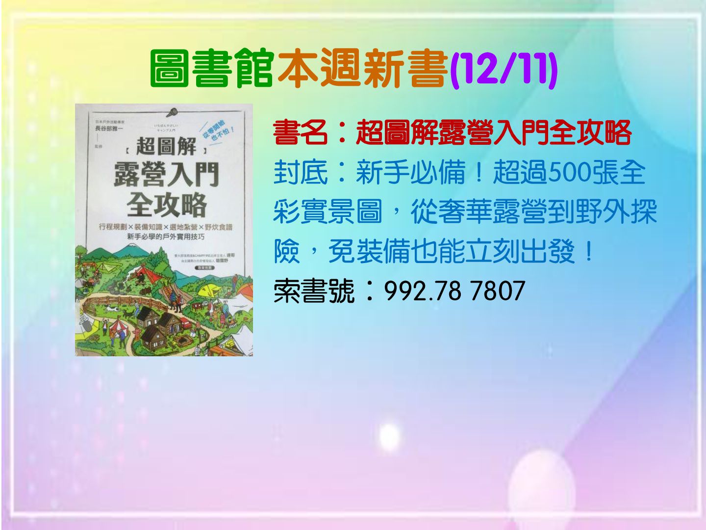 圖書館本週新書(12/11) 書名:超圖解露營入門全攻略 封底:新手必備!超過500張全 彩實景圖,從奢華露營到野外探 險,免裝備也能立刻出發! 索書號:992.78 7807