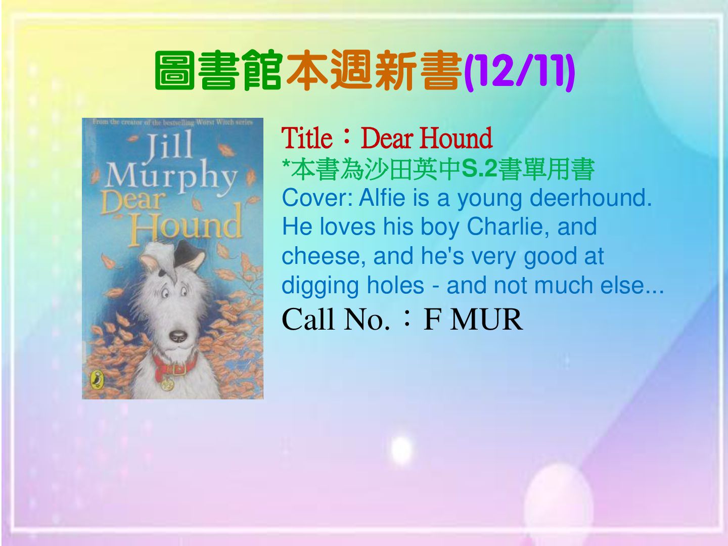 圖書館本週新書(12/11) Title:Dear Hound *本書為沙田英中S.2書單用書 Cover: Alfie is a young deerhound.