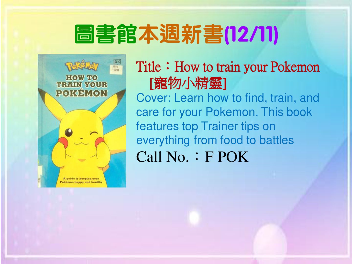 圖書館本週新書(12/11) Title:How to train your Pokemon [寵物小精靈] Cover: Learn how