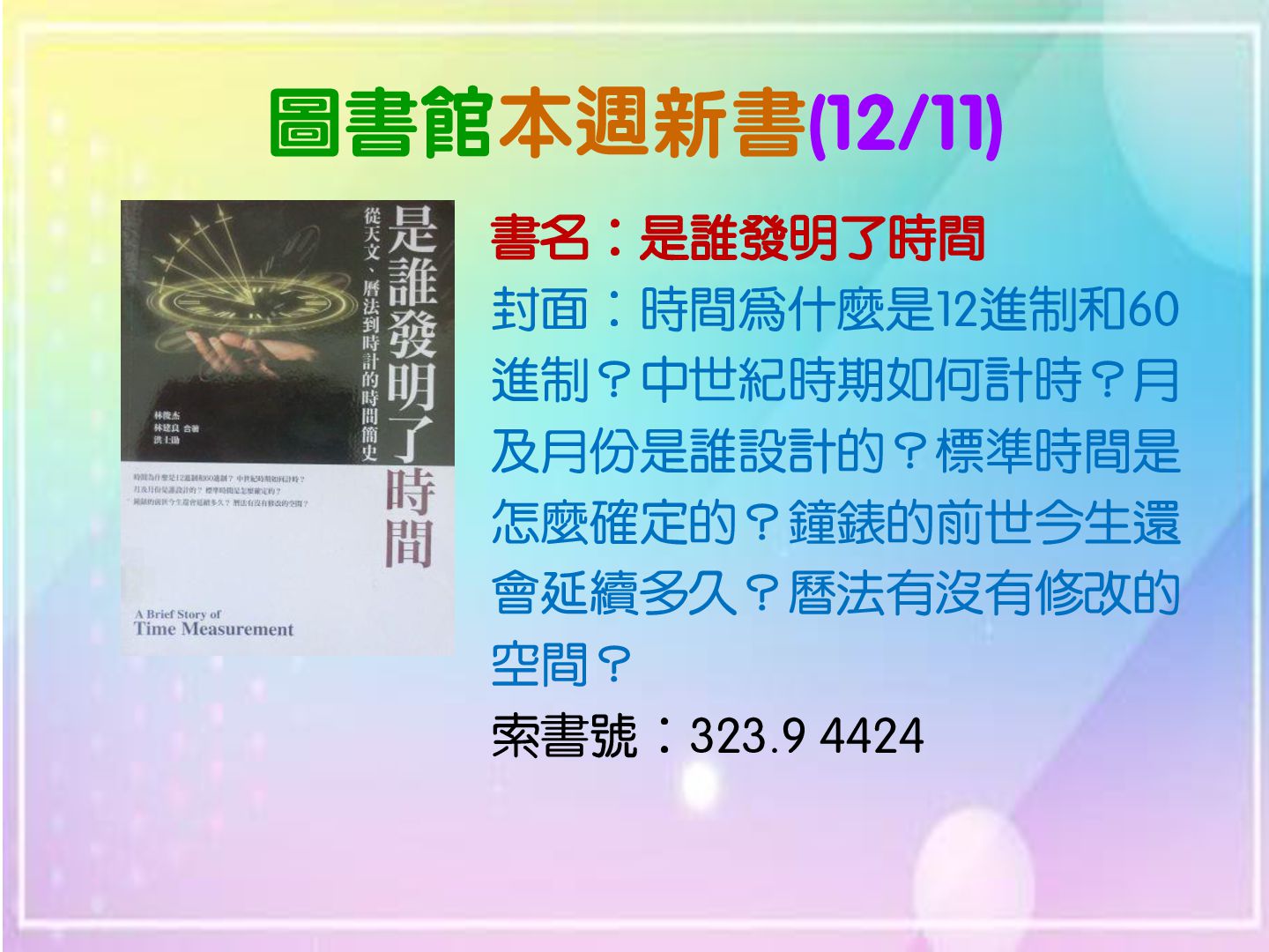 圖書館本週新書(12/11) 書名:是誰發明了時間 封面:時間為什麼是12進制和60 進制?中世紀時期如何計時?月 及月份是誰設計的?標準時間是 怎麼確定的?鐘錶的前世今生還 會延續多久?曆法有沒有修改的 空間? 索書號:323.9 4424