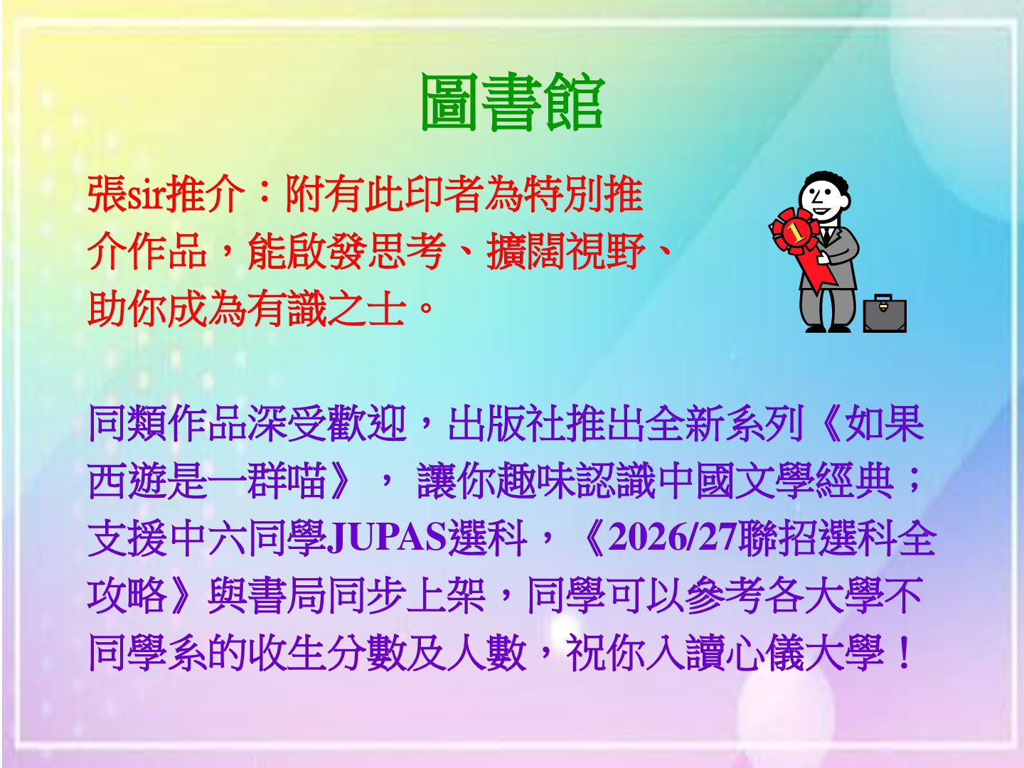 圖書館 張sir推介:附有此印者為特別推 介作品,能啟發思考、擴闊視野、 助你成為有識之士。 同類作品深受歡迎,出版社推出全新系列《如果 西遊是一群喵》, 讓你趣味認識中國文學經典; 支援中六同學JUPAS選科,《2026/27聯招選科全 攻略》與書局同步上架,同學可以參考各大學不 同學系的收生分數及人數,祝你入讀心儀大學!