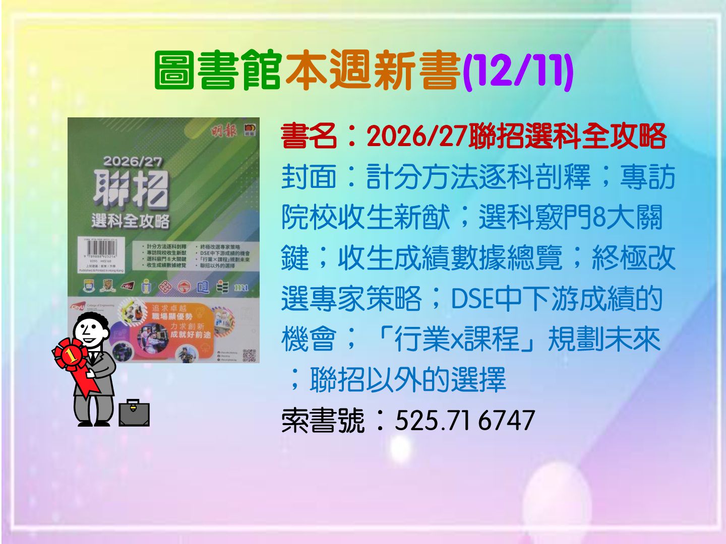 圖書館本週新書(12/11) 書名:2026/27聯招選科全攻略 封面:計分方法逐科剖釋;專訪 院校收生新猷;選科竅門8大關 鍵;收生成績數據總覽;終極改 選專家策略;DSE中下游成績的 機會;「行業x課程」規劃未來 ;聯招以外的選擇 索書號:525.71 6747
