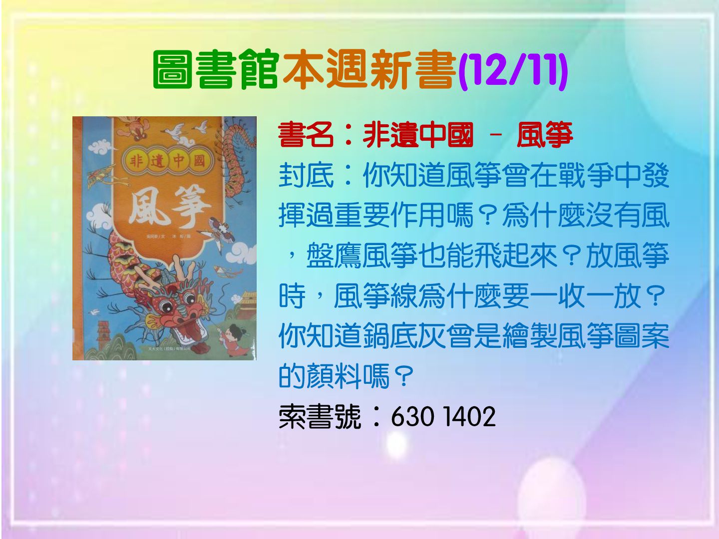 圖書館本週新書(12/11) 書名:非遺中國 – 風箏 封底:你知道風箏曾在戰爭中發 揮過重要作用嗎?為什麼沒有風 ,盤鷹風箏也能飛起來?放風箏 時,風箏線為什麼要一收一放? 你知道鍋底灰曾是繪製風箏圖案 的顏料嗎?