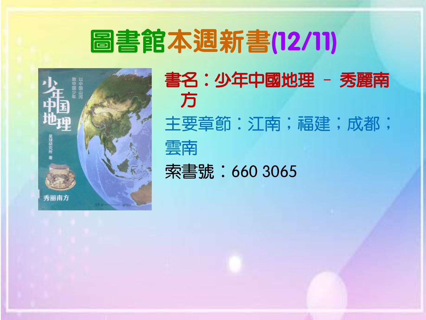 圖書館本週新書(12/11) 書名:少年中國地理 – 秀麗南 方 主要章節:江南;福建;成都; 雲南 索書號:660 3065