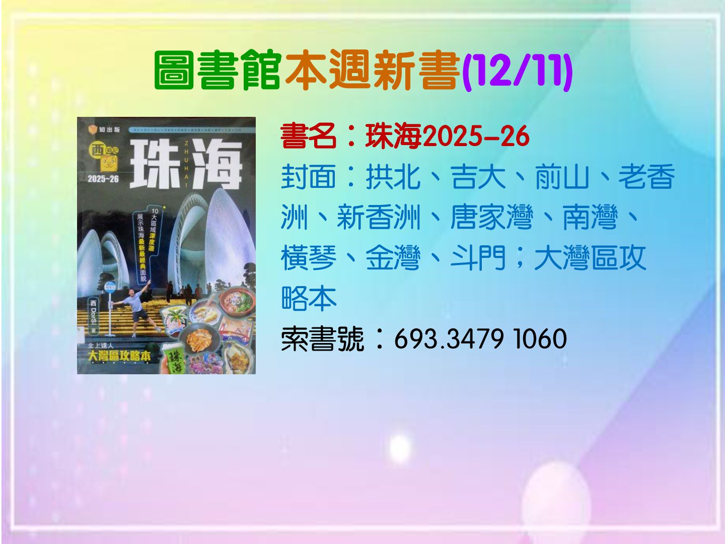 圖書館本週新書(12/11) 書名:珠海2025-26 封面:拱北、吉大、前山、老香 洲、新香洲、唐家灣、南灣、 橫琴、金灣、斗門;大灣區攻 略本 索書號:693.3479 1060