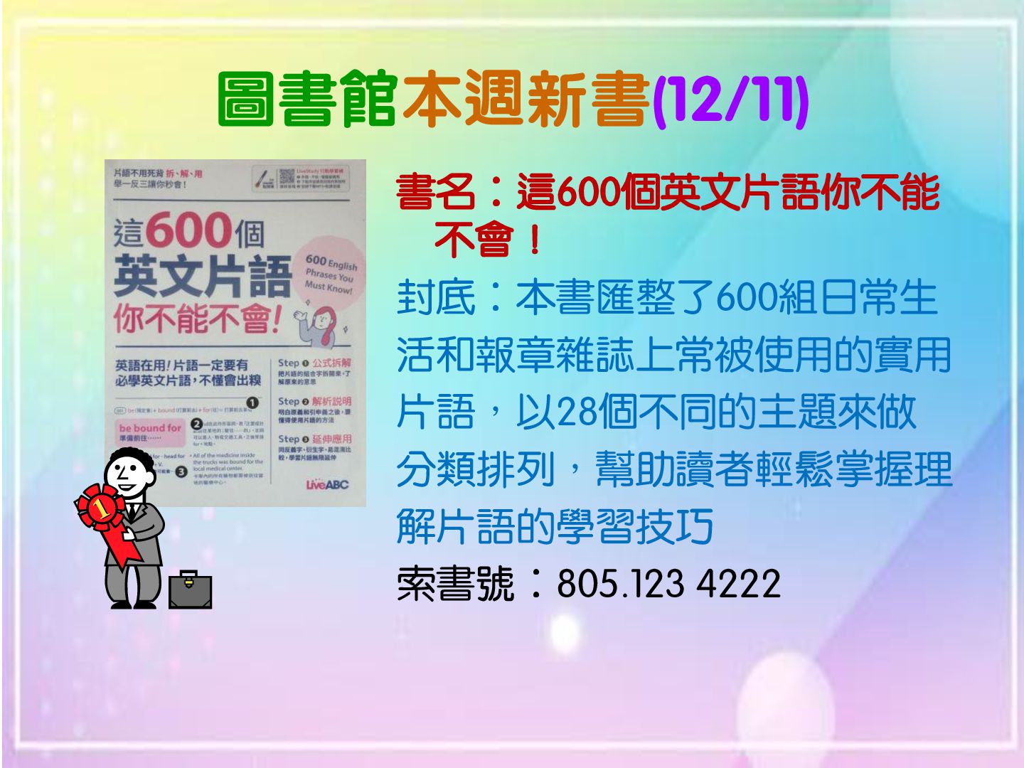 圖書館本週新書(12/11) 書名:這600個英文片語你不能 不會! 封底:本書匯整了600組日常生 活和報章雜誌上常被使用的實用 片語,以28個不同的主題來做 分類排列,幫助讀者輕鬆掌握理 解片語的學習技巧 索書號:805.123 4222