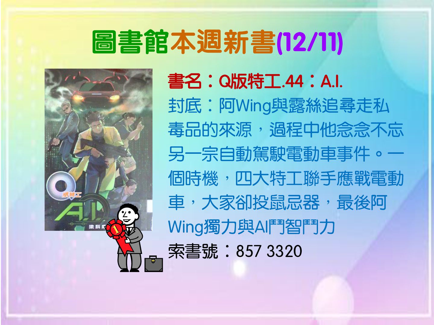 圖書館本週新書(12/11) 書名:Q版特工.44:A.I. 封底:阿Wing與露絲追尋走私 毒品的來源,過程中他念念不忘 另一宗自動駕駛電動車事件。一 個時機,四大特工聯手應戰電動 車,大家卻投鼠忌器,最後阿 Wing獨力與AI鬥智鬥力 索書號:857 3320
