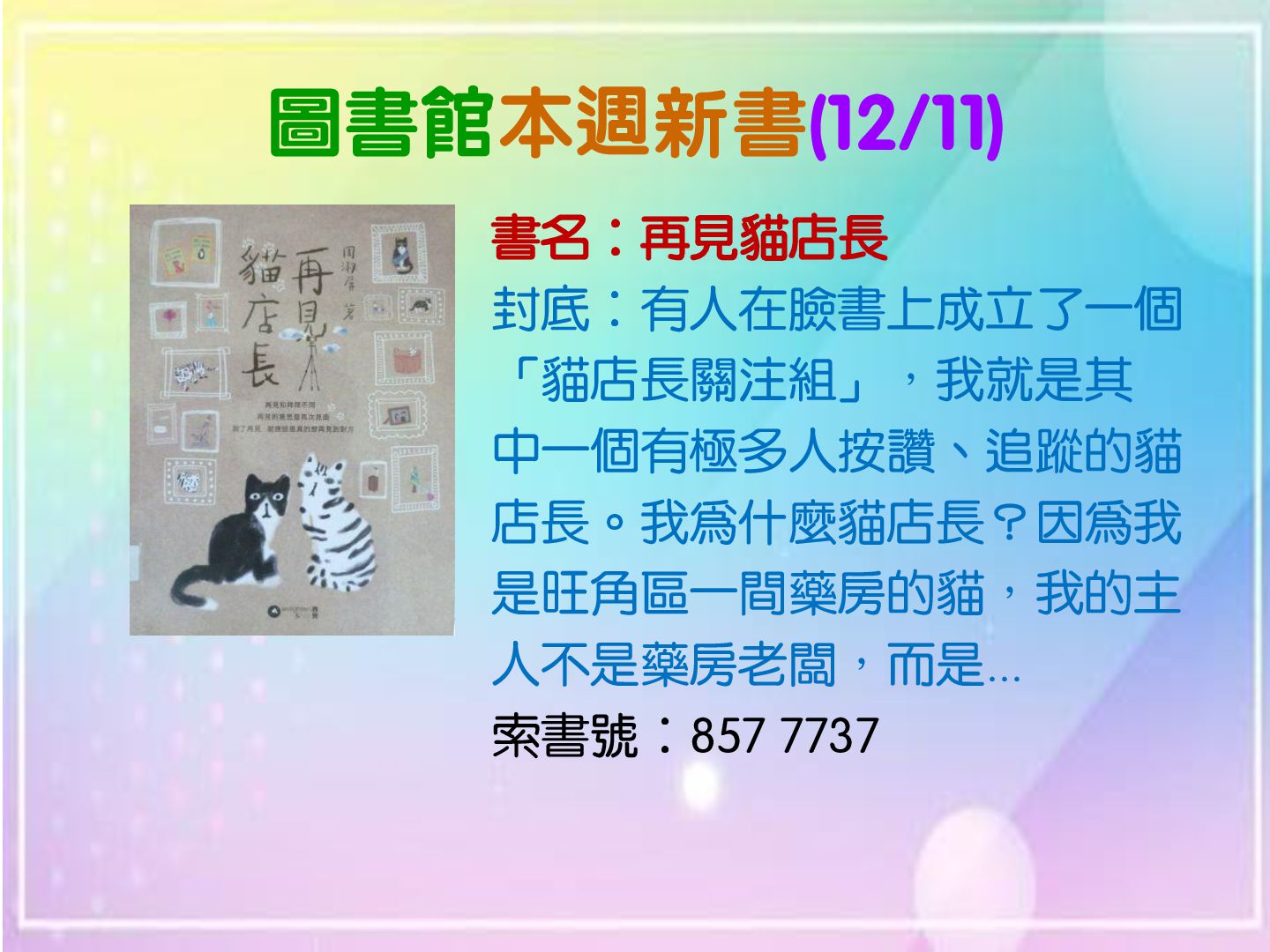 圖書館本週新書(12/11) 書名:再見貓店長 封底:有人在臉書上成立了一個 「貓店長關注組」,我就是其 中一個有極多人按讚、追蹤的貓 店長。我為什麼貓店長?因為我 是旺角區一間藥房的貓,我的主 人不是藥房老闆,而是... 索書號:857 7737