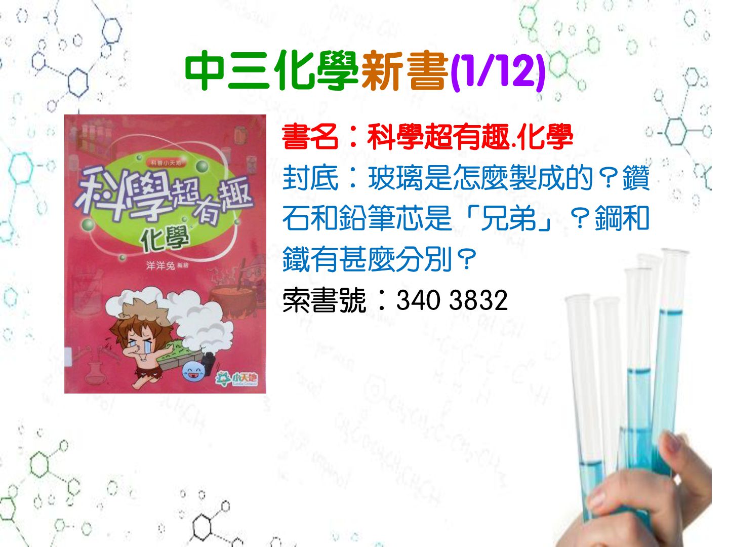 中三化學新書(1/12) 書名:科學超有趣.化學 封底:玻璃是怎麼製成的?鑽 石和鉛筆芯是「兄弟」?鋼和 鐵有甚麼分別? 索書號:340 3832