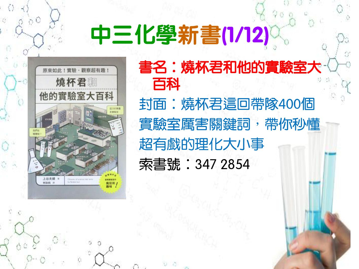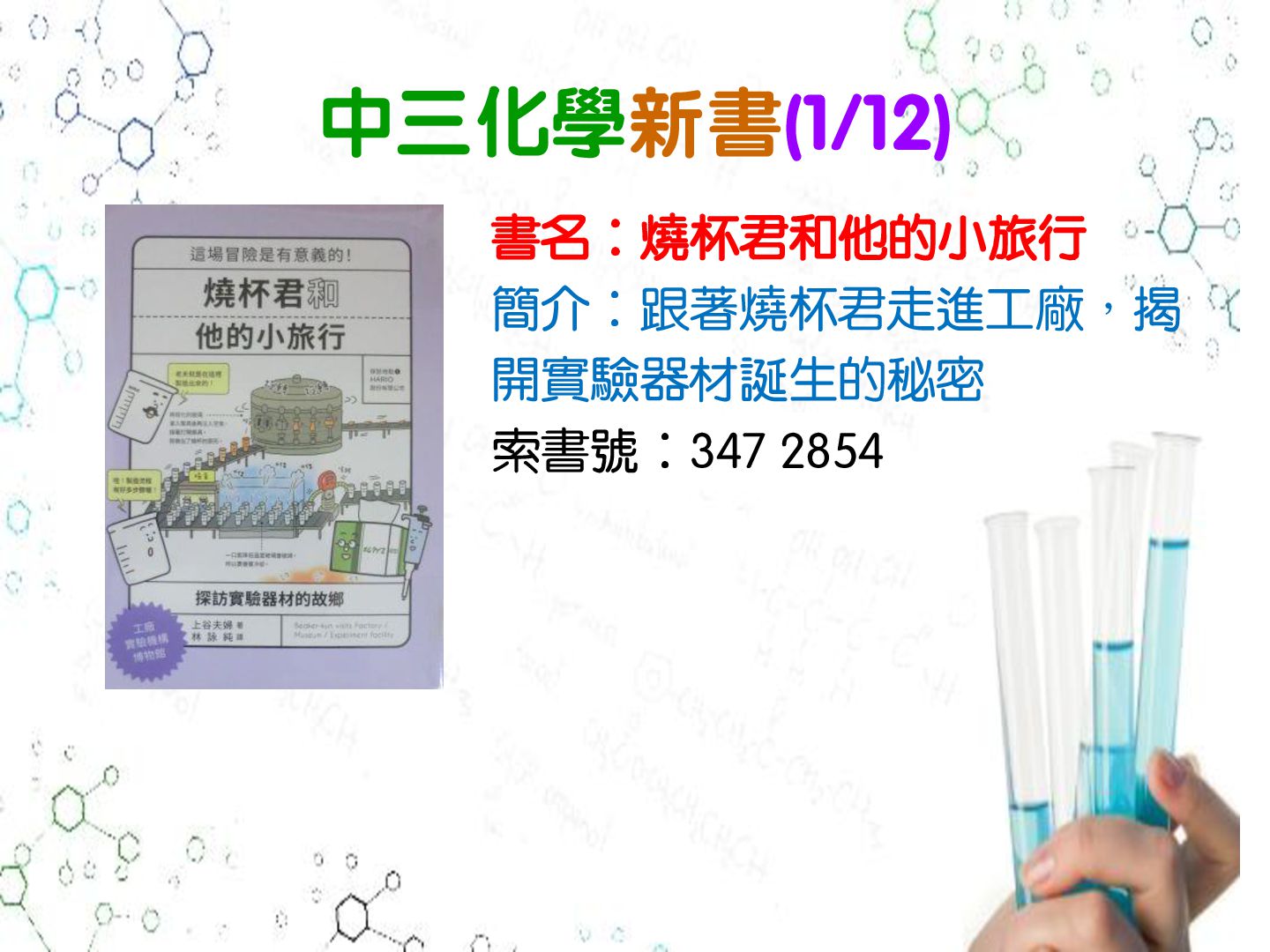 中三化學新書(1/12) 書名:燒杯君和他的小旅行 簡介:跟著燒杯君走進工廠,揭 開實驗器材誕生的秘密 索書號:347 2854