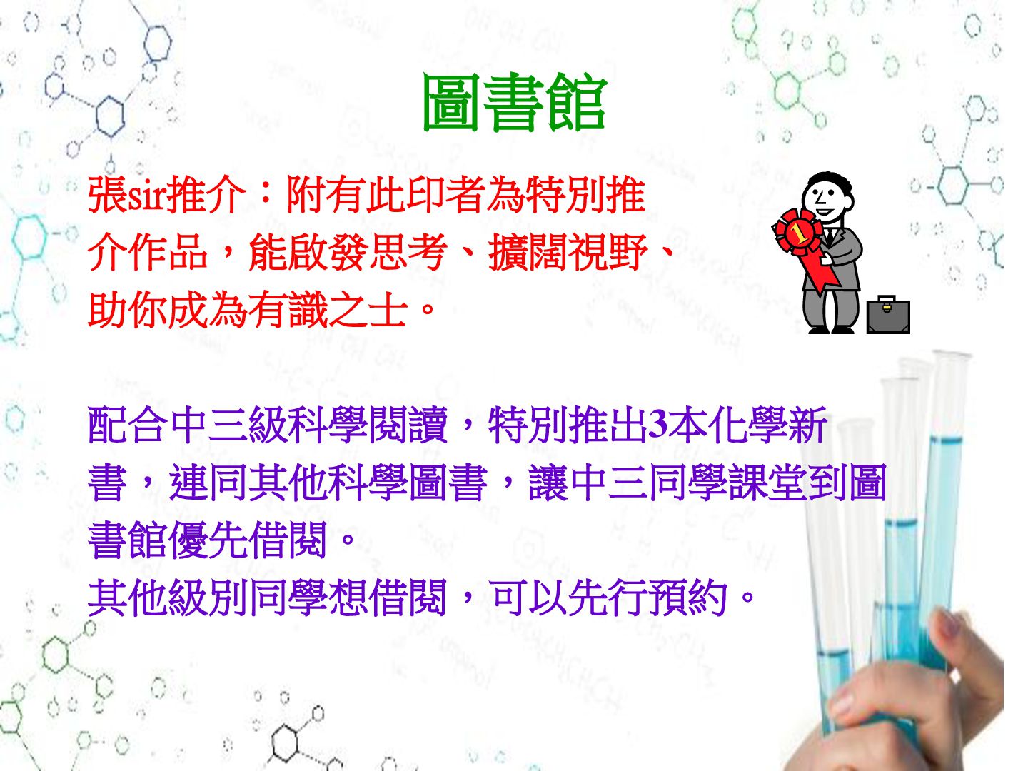 圖書館 張sir推介:附有此印者為特別推 介作品,能啟發思考、擴闊視野、 助你成為有識之士。 配合中三級科學閱讀,特別推出3本化學新 書,連同其他科學圖書,讓中三同學課堂到圖 書館優先借閱。 其他級別同學想借閱,可以先行預約。