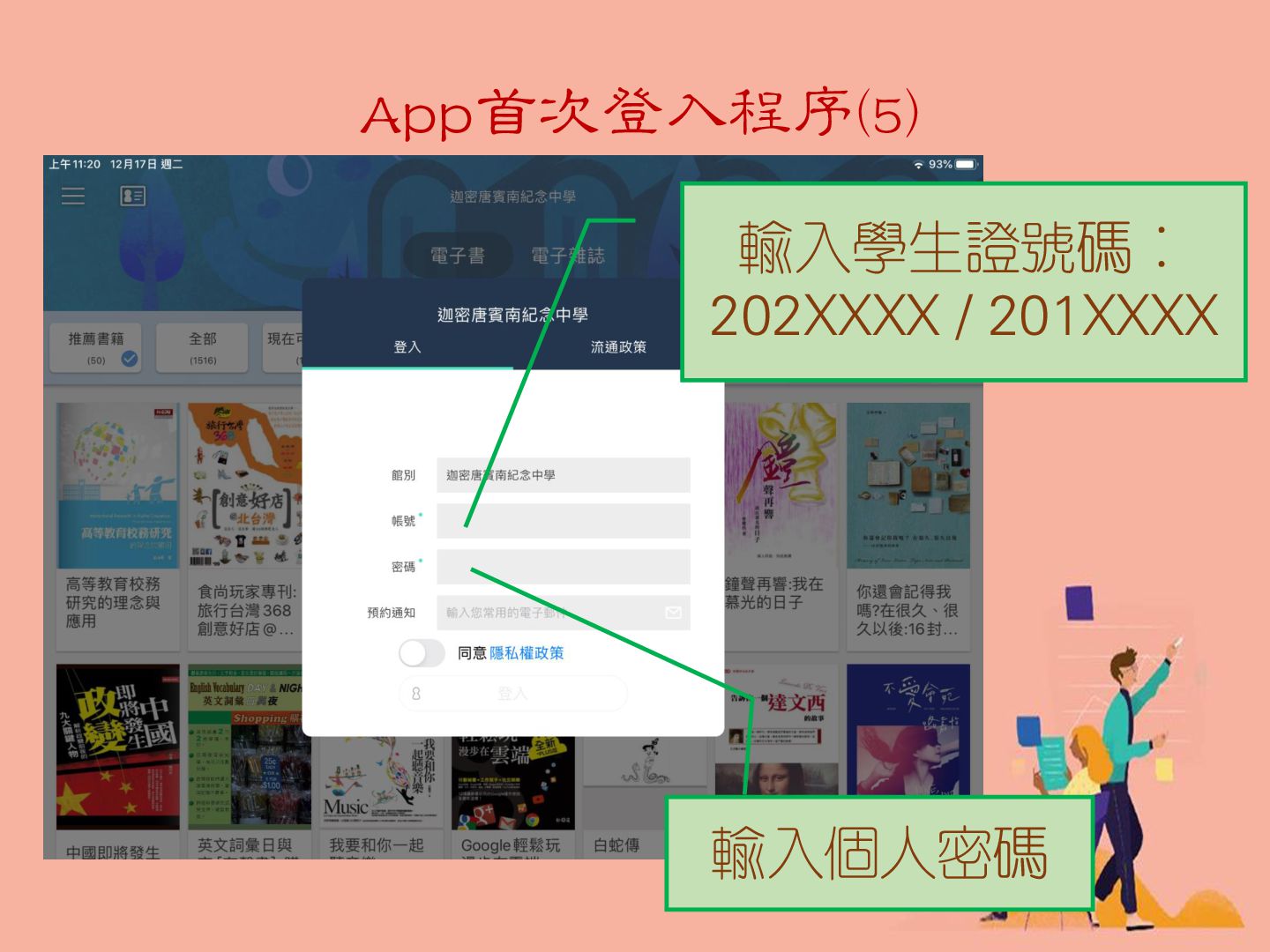 App首次登入程序(5) 輸入學生證號碼: 202XXXX / 201XXXX 輸入個人密碼