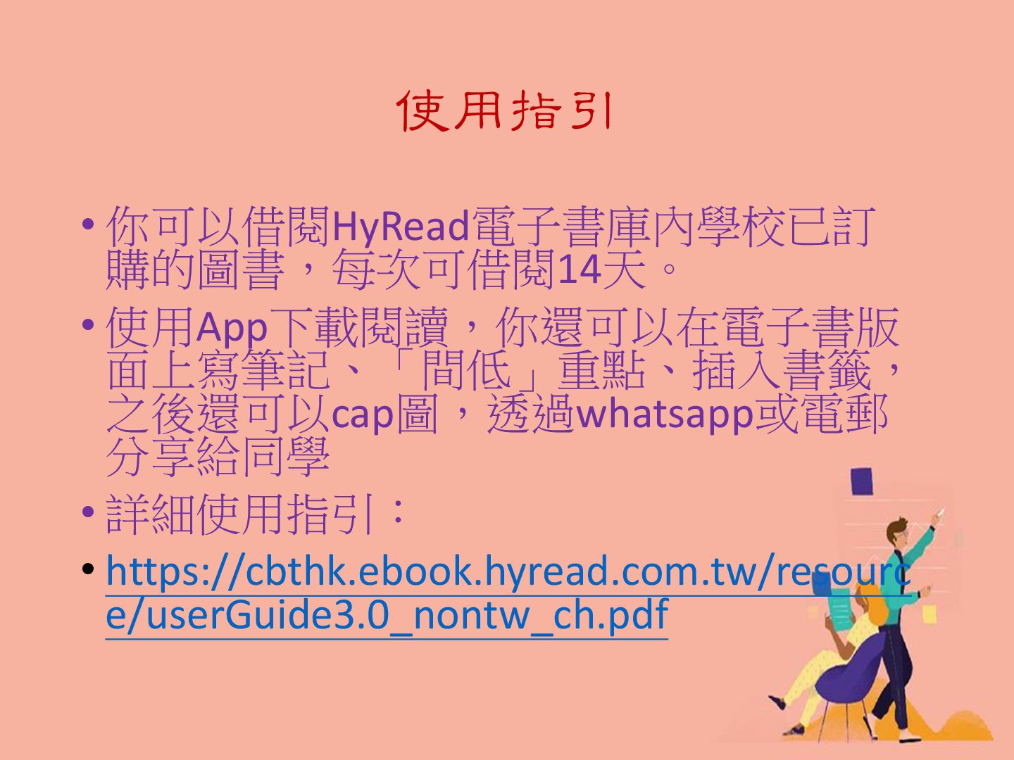 詳細使用指引: • https://cbthk.ebook.hyread.com.tw/resourc e/userGuide3.0_nontw_ch.pdf