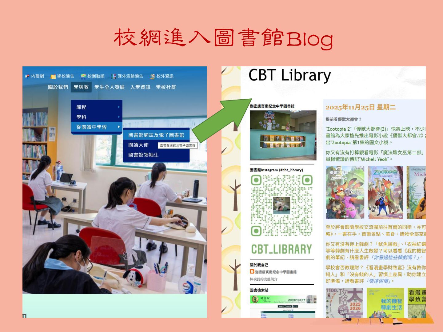 校網進入圖書館Blog 1.按「學與教」 2.按「從閱讀中學習」 3.按「圖書館網誌及 電子圖書館」