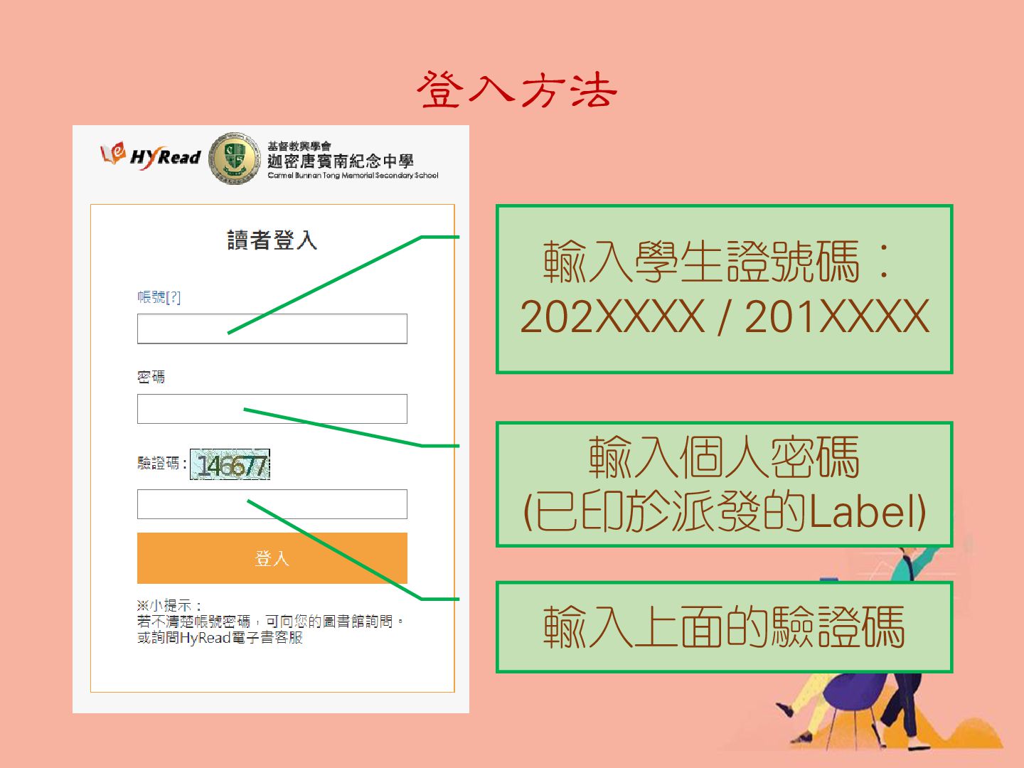 登入方法 輸入學生證號碼: 202XXXX / 201XXXX 輸入個人密碼 (已印於派發的Label) 輸入上面的驗證碼