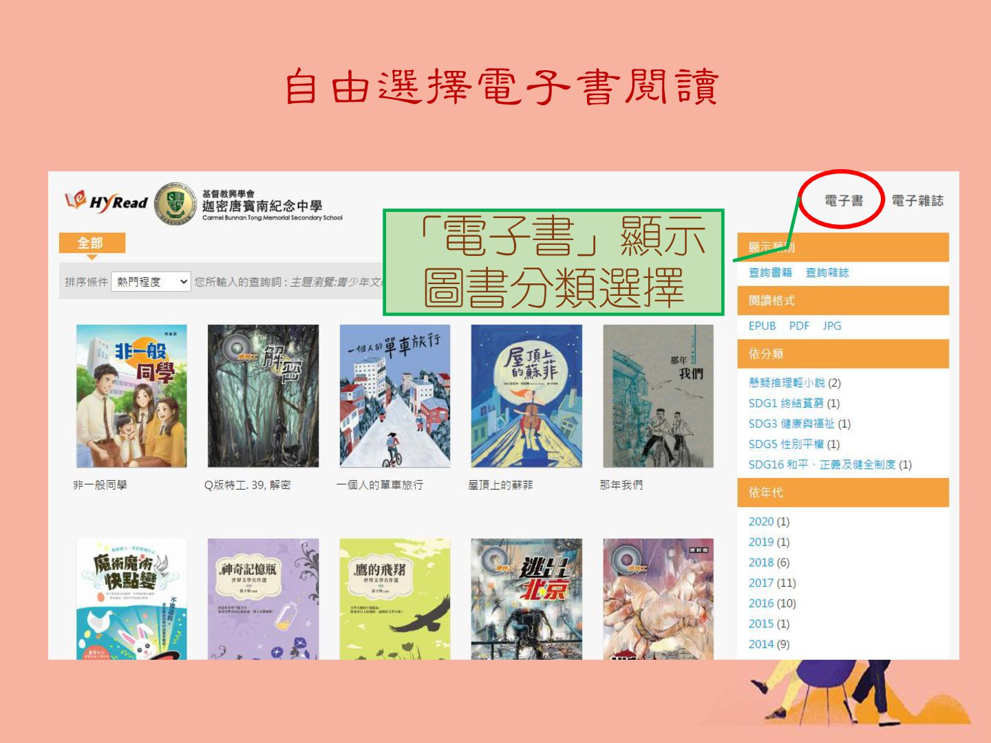 自由選擇電子書閱讀 「電子書」顯示 圖書分類選擇