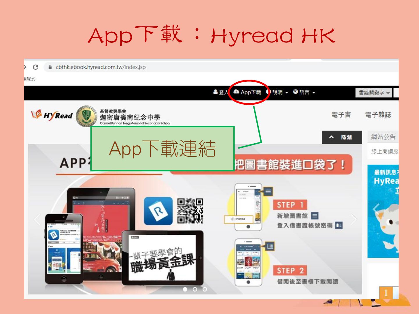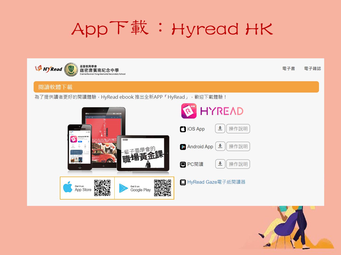 使用指引 • 你可以借閱HyRead電子書庫內學校已訂 購的圖書,每次可借閱14天。 • 使用App下載閱讀,你還可以在電子書版 面上寫筆記、「間低」重點、插入書籤, 之後還可以cap圖,透過whatsapp或電郵 分享給同學 •