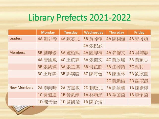 謝以筠 4A 陳芯兒 5B 黃綽暉 4A 陳栩橦 4B 郭可穎 4A 張悅欣 Members 5B 劉珮瑜 5A 鍾栢熙 4A 陸靜楠 4A 麥馨文 4D 吳沛靜 4A 唐國鳳 4C 王苡霖 3A 張愷文 4C 黃泳瑤 3B 黃穎心 3B 張凱琪 3A 張芷淇 3B 何芷歆 3B 江綽錡 3C 梁莉 3C 王琛美 3B 鄧媄殷 3C 陳海逸 2B 陳玉林 2A 劉欣圓 2C 黃灝倫 2D 謝宗諺 New Members 2A 李向晴 2A 方嘉敏 2D 賴敏兒 3A 鄧泳楠 1A 陳紫婷 1C 黃道道 1B 勞凱婷 1A 林穎彤 1B 韋茵茵 1B 李頌茵 1D 陳天怡 1D 蘇凱瑩 1B 陳子浩