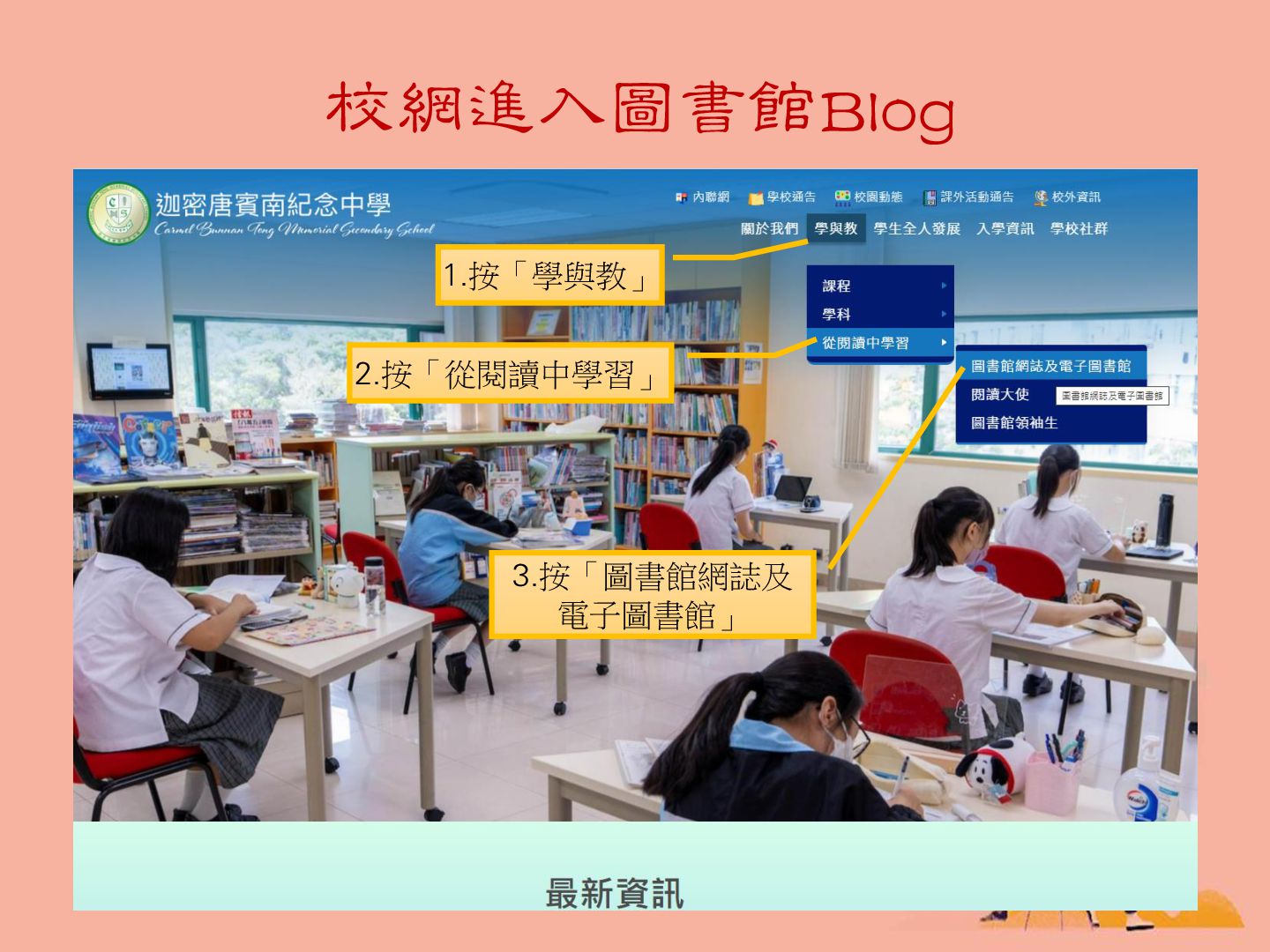 校網進入圖書館Blog 1.按「學與教」 2.按「從閱讀中學習」 3.按「圖書館網誌及 電子圖書館」