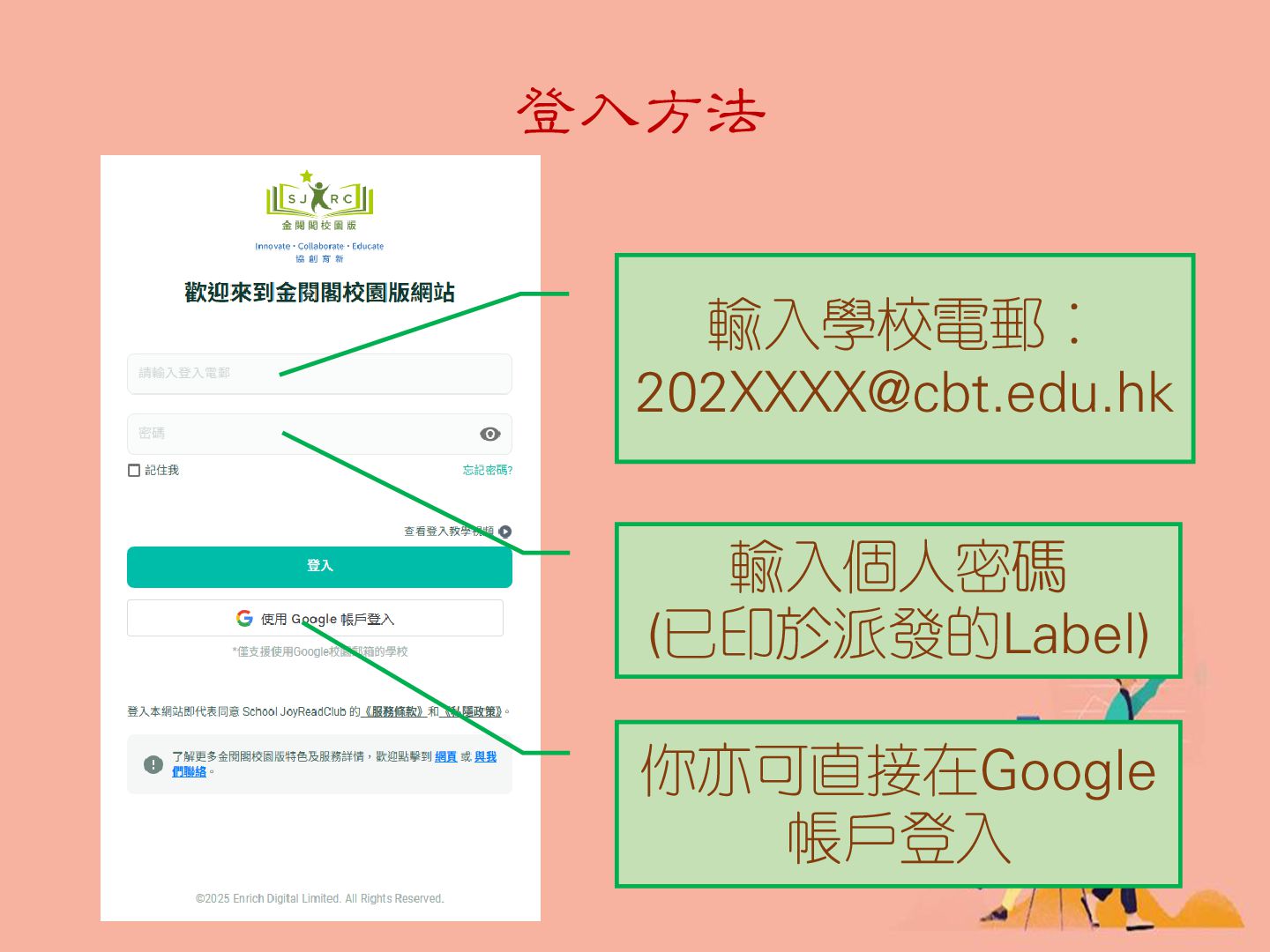 輸入個人密碼 (已印於派發的Label) 你亦可直接在Google 帳戶登入