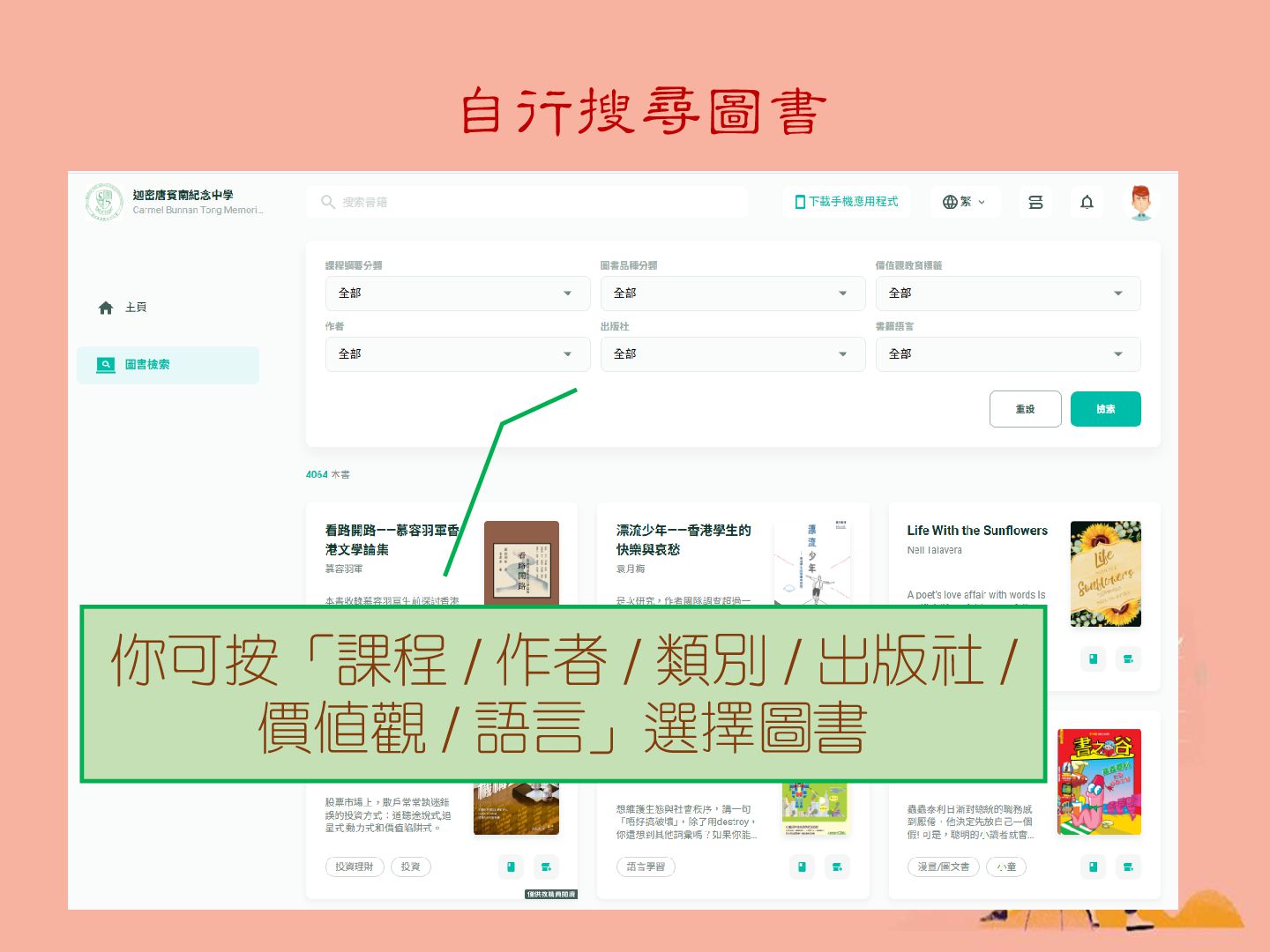 自行搜尋圖書 你可按「課程 / 作者 / 類別 / 出版社 / 價值觀