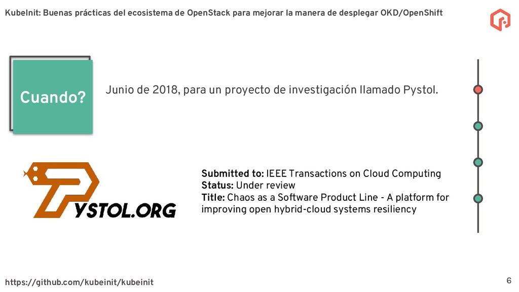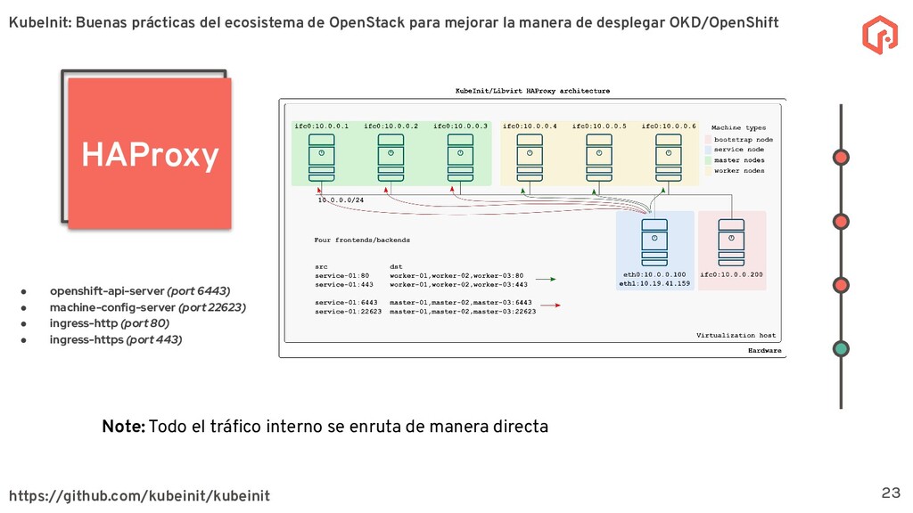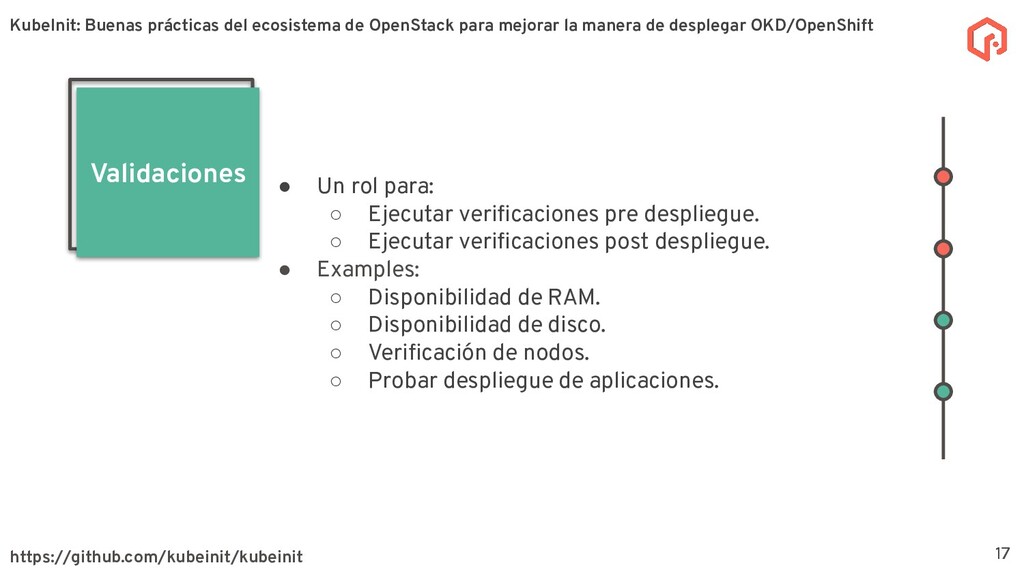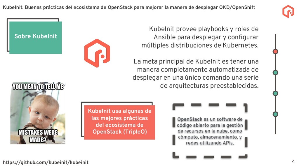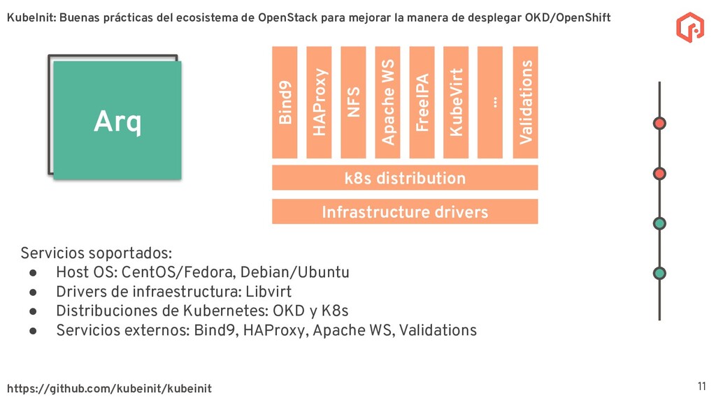 desplegar y configurar múltiples distribuciones de Kubernetes. La meta principal de KubeInit es tener una manera completamente automatizada de desplegar en una único comando una serie de arquitecturas preestablecidas. Sobre KubeInit KubeInit usa algunas de las mejores prácticas del ecosistema de OpenStack (TripleO) 4 OpenStack es un software de código abierto para la gestión de recursos en la nube, como cómputo, almacenamiento, y redes utilizando APIs. KubeInit: Buenas prácticas del ecosistema de OpenStack para mejorar la manera de desplegar OKD/OpenShift