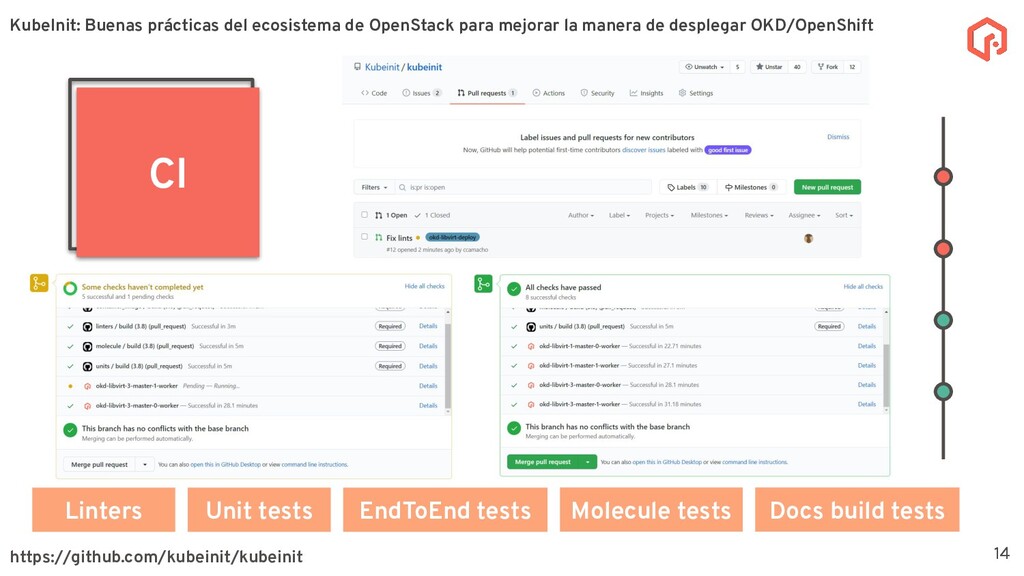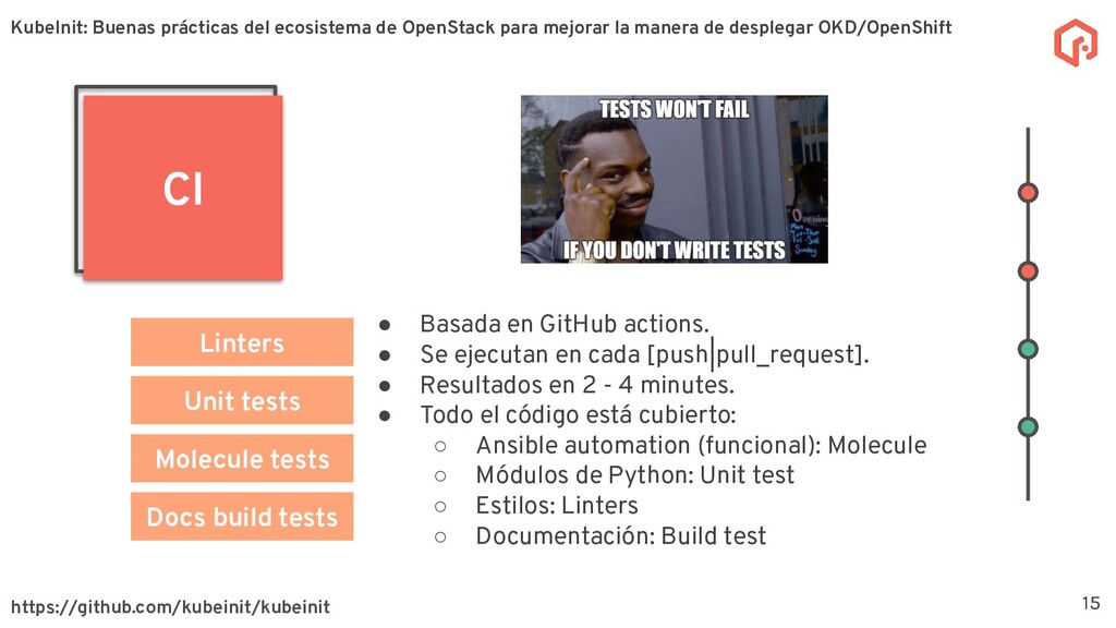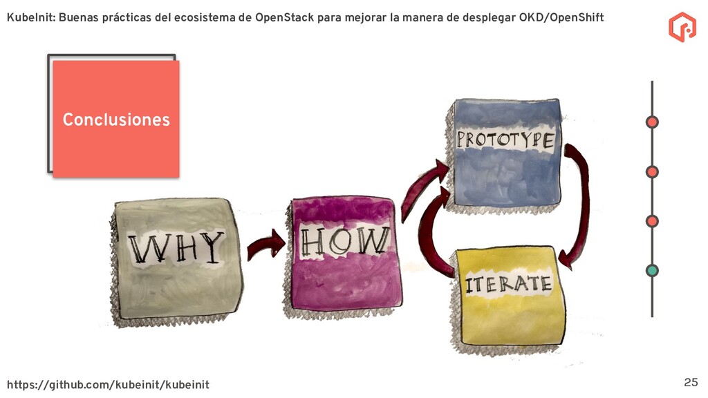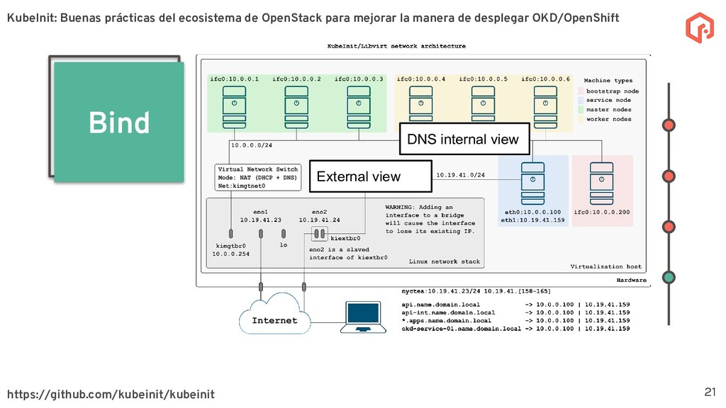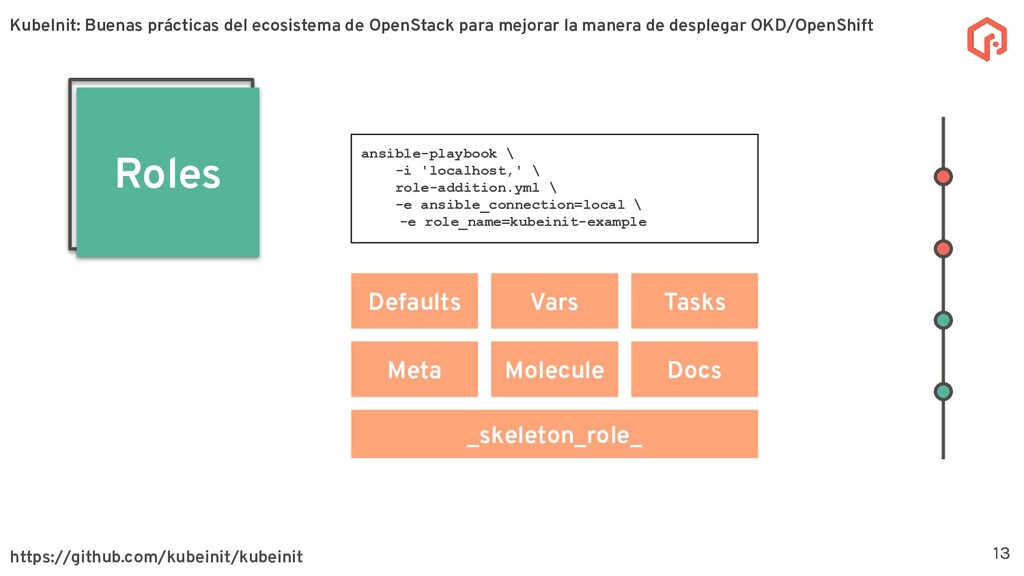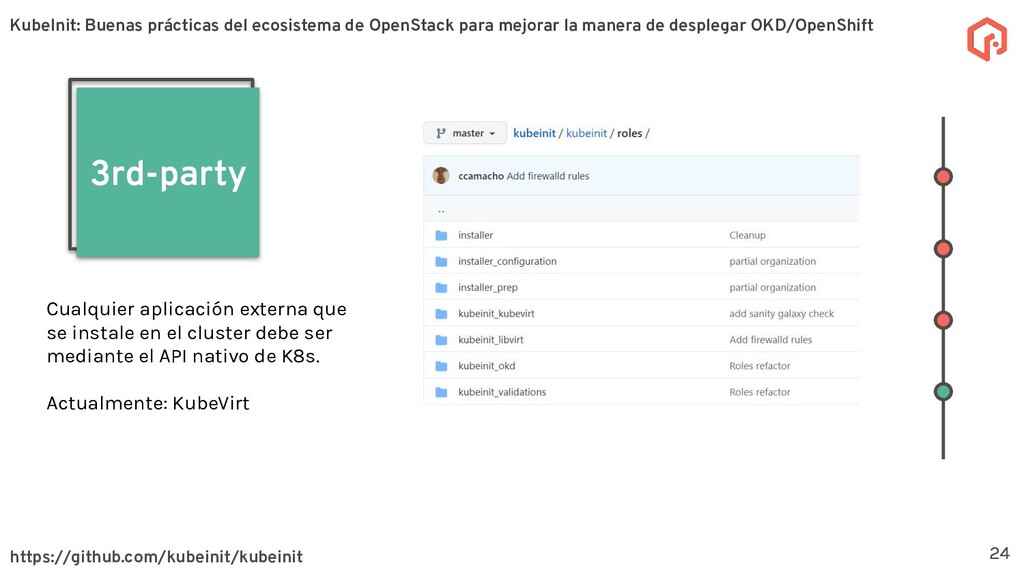 desplegar y configurar múltiples distribuciones de Kubernetes. La meta principal de KubeInit es tener una manera completamente automatizada de desplegar en una único comando una serie de arquitecturas preestablecidas. Sobre KubeInit KubeInit usa algunas de las mejores prácticas del ecosistema de OpenStack (TripleO) 4 OpenStack es un software de código abierto para la gestión de recursos en la nube, como cómputo, almacenamiento, y redes utilizando APIs. KubeInit: Buenas prácticas del ecosistema de OpenStack para mejorar la manera de desplegar OKD/OpenShift