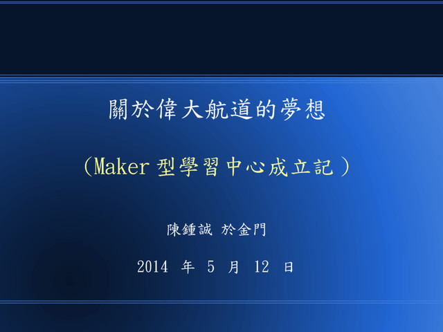 出申請。 • 一但申請過之後就可以運用我所任教的金門大學資工系的空間 進行 Maker 型的技職教育 ( 自學團體 ) ,讓這些小學、中學 生提前到大學學習,我們會提供適當的學習資源與協助。