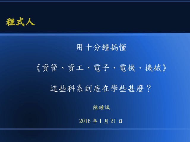 用十分鐘搞懂 《資管、資工、電子、電機、機械》 這些科系到底在學些甚麼? 陳鍾誠 2016 年 1 月 21 日