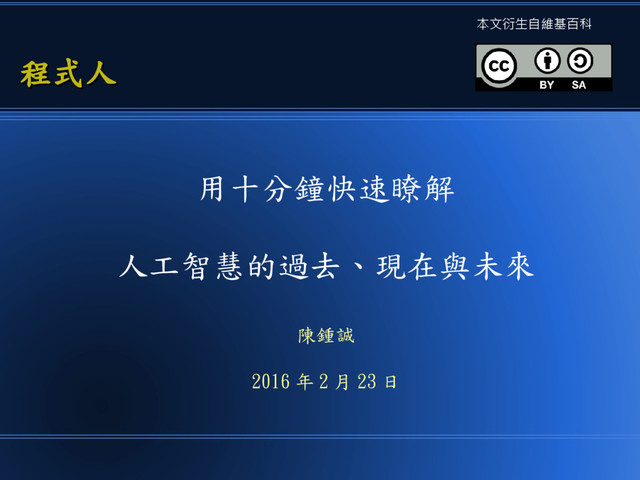 用十分鐘快速瞭解 人工智慧的過去、現在與未來 陳鍾誠 2016 年 2 月 23 日 程式人
