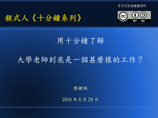 用十分鐘了解 大學老師到底是一個甚麼樣的工作? 陳鍾誠 2016 年 6 月 24 日 程式人《十分鐘系列》