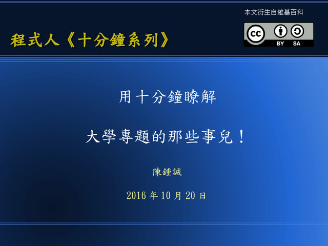 用十分鐘瞭解 大學專題的那些事兒! 陳鍾誠 2016 年 10 月 20 日 程式人《十分鐘系列》