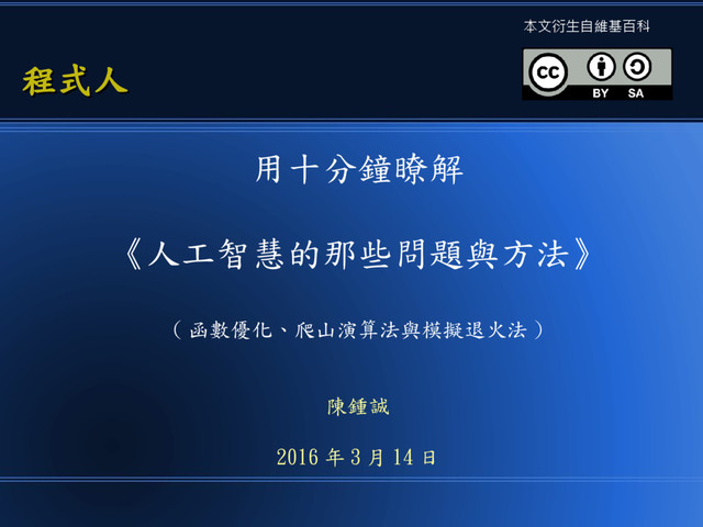 甚至、對於《影像和語音辨識》問題 • 只要能定義兩個影像或語音的相似程度,也能夠 用《爬山演算法來求解》找出最相似的語音 ( 通 常就是正確解答 ) 。 •