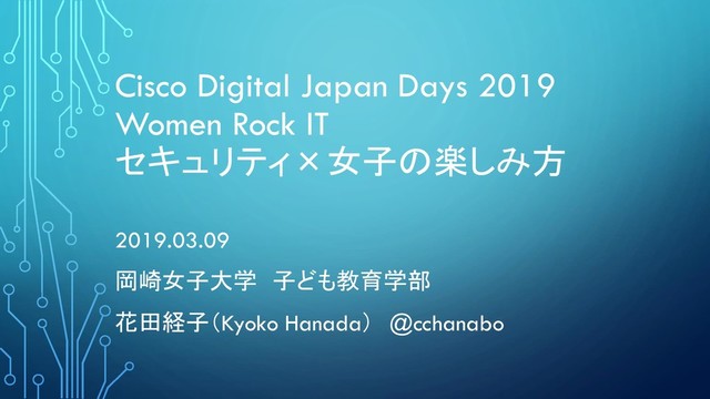 Cisco Digital Japan Days2019 の "Women Rock-IT"にて登壇した時の資料(一部修正あり) "セキュリティ×女子の楽しみ方" 2019/03/09 シスコシステムズ合同会社東京本社にて