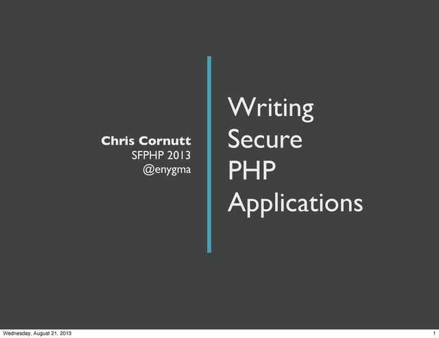 ‘UTF-8’); // UTF-7 filter_var(‘invalid.email.com’, FILTER_VALID_EMAIL); // false /* Using 3rd party */ use Zend\Escaper\Escaper; $twig->render(‘...’); // escapes by default, but... ?> Don’t forget the context...especially if there’s multiple! 25 Wednesday, August 21, 2013