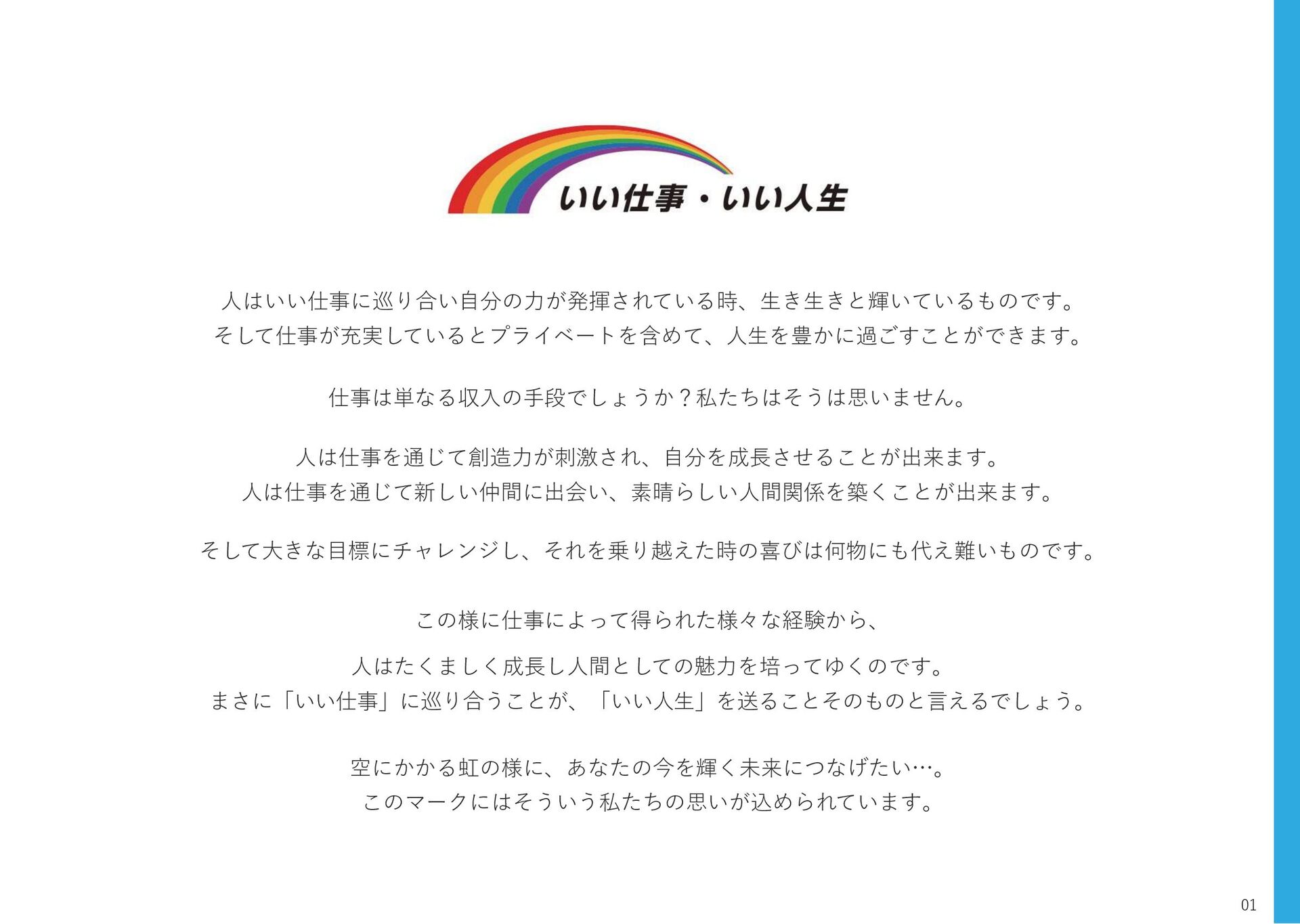 人はいい仕事に巡り合い自分の力が発揮されている時、生き生きと輝いているものです。 そして仕事が充実しているとプライベートを含めて、人生を豊かに過ごすことができます。 仕事は単なる収入の手段でしょうか?私たちはそうは思いません。 人は仕事を通じて創造力が刺激され、自分を成長させることが出来ます。 人は仕事を通じて新しい仲間に出会い、素晴らしい人間関係を築くことが出来ます。 そして大きな目標にチャレンジし、それを乗り越えた時の喜びは何物にも代え難いものです。 この様に仕事によって得られた様々な経験から、 人はたくましく成長し人間としての魅力を培ってゆくのです。 まさに「いい仕事」に巡り合うことが、「いい人生」を送ることそのものと言えるでしょう。 空にかかる虹の様に、あなたの今を輝く未来につなげたい…。